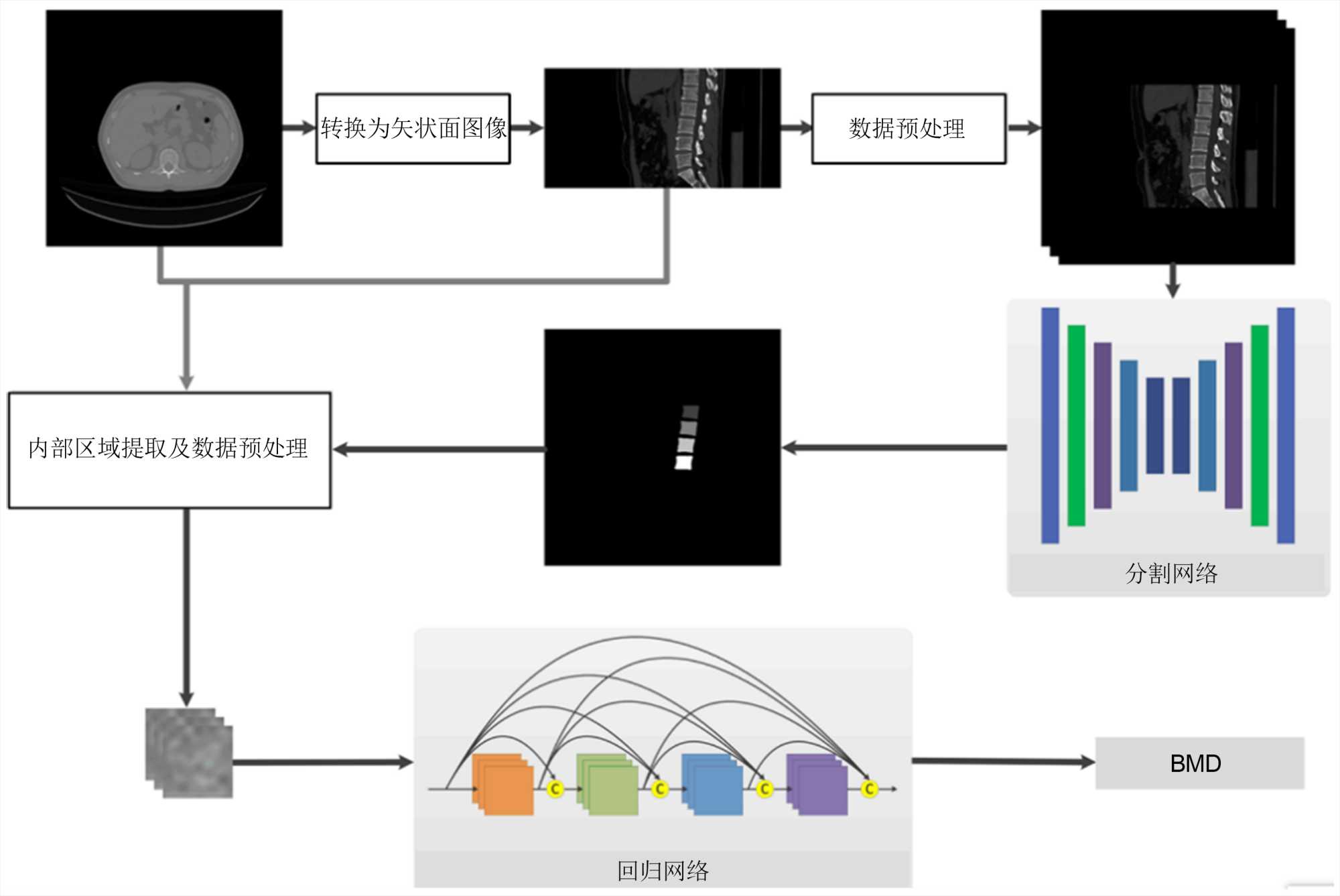 图1展示了我们提出的框架概述。首先,我们将CT图像输入U-Net模型,进行腰椎体的自动分割。然后,对分割结果进行腰椎体的定位处理,提取出腰椎体的内部信息。最后,通过回归模型对提取的信息进行分析和计算,得到骨密度值。整个过程利用深度学习技术,实现了骨密度的自动计算,确保了计算的准确性和效率。