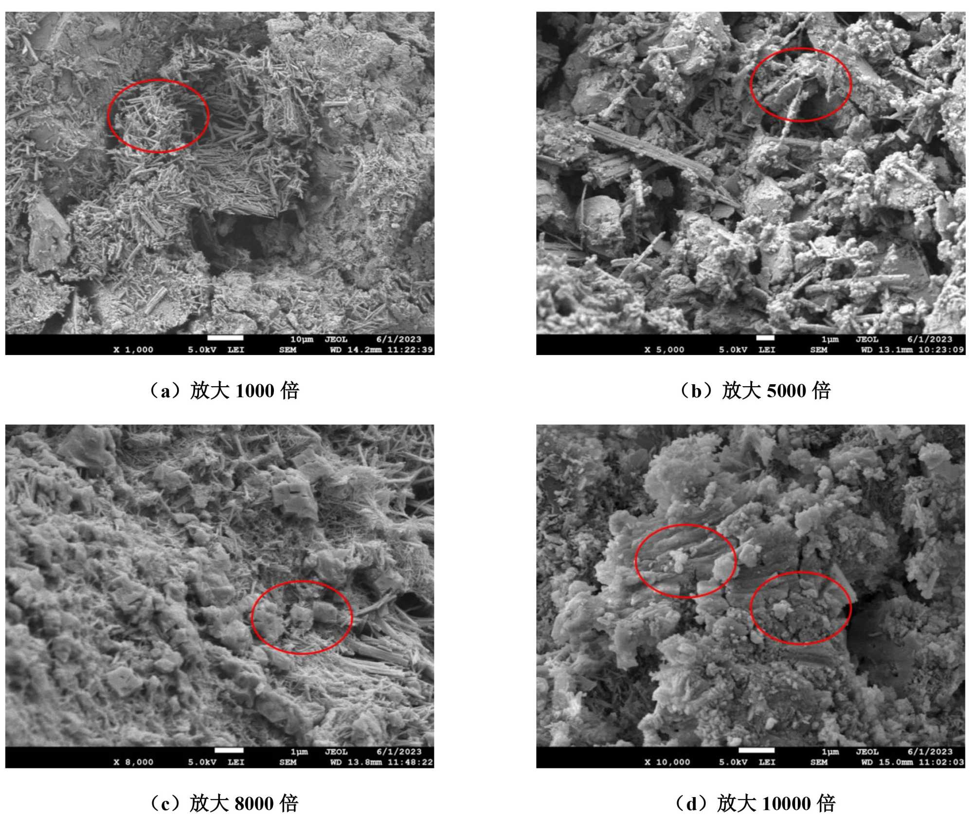 为进一步验证道路基层中的水泥水化产物是否与存在的易溶盐发生化学反应并生成相关产物,采用JSM 7610 FPlus扫描电镜观察拱胀处基层芯样的微观形貌,观测结果如图5所示。