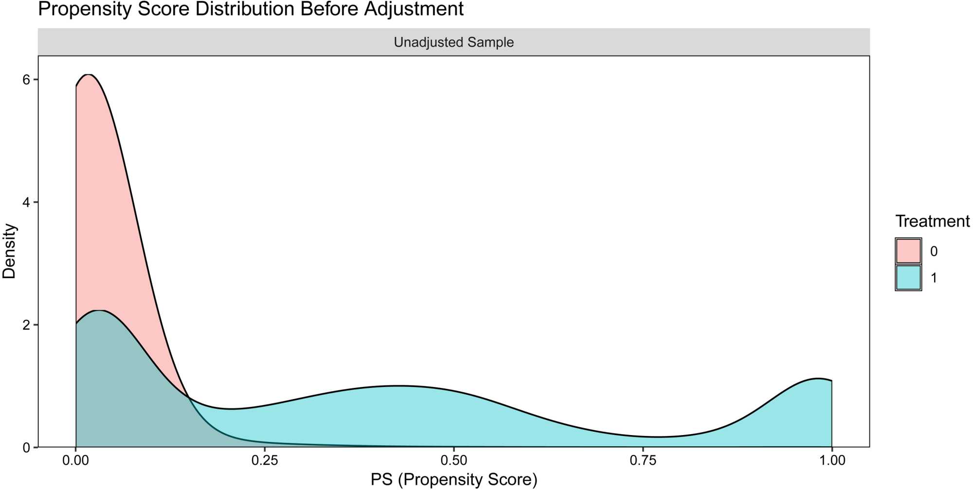 对数据集进行调整前,首先计算倾向性得分,图1为处理组和控制组数据的倾向性得分分布情况。其中,蓝色区域表示个体接受处理的倾向性得分分布,红色区域表示未接受处理的倾向性得分分布。这直观地表明,在原始状态下,处理组和控制组的混杂变量存在系统性差异,若直接比较这两组的结果,将会得出偏倚的结论。尽管两组有差异,但在倾向性得分的大部分区间内,重合区域较多,满足共同支撑域条件,便于后续研究。