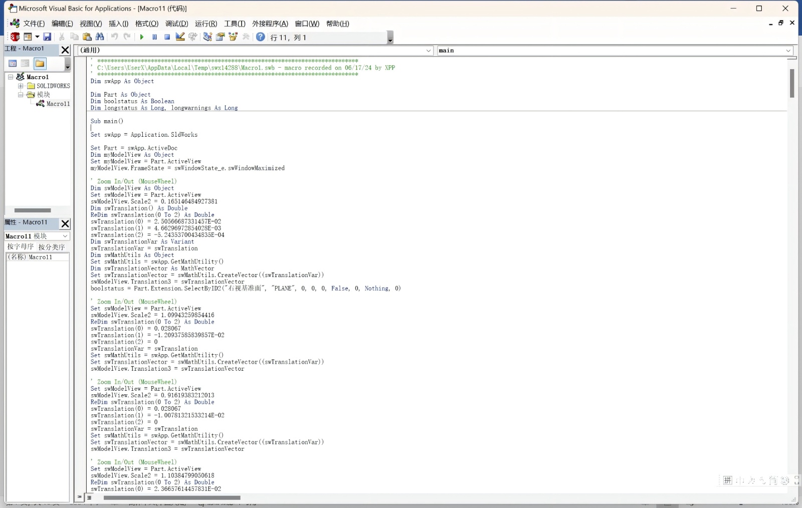 SolidWorks的宏录制功能为实现建模流程自动化提供了基础支持,它能够完整记录用户操作序列,并生成可重复调用的VBA代码,从而显著提升建模效率。其基本操作流程包括:启动录制、执行建模操作、停止录制并保存宏。更重要的是,通过宏编辑功能可对自动生成的代码进行查看与修改,为后续定制化开发奠定基础[15]。本次建模所形成的宏录制源代码如图4所示。
