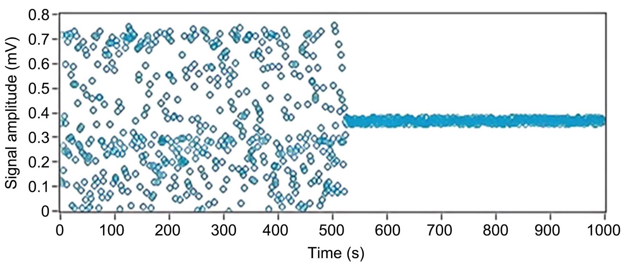 Figure 5. Comparison of signal stability between two demodulation methods (The period before 500 seconds is the traditional method, and the period after 500 seconds is the improved method)