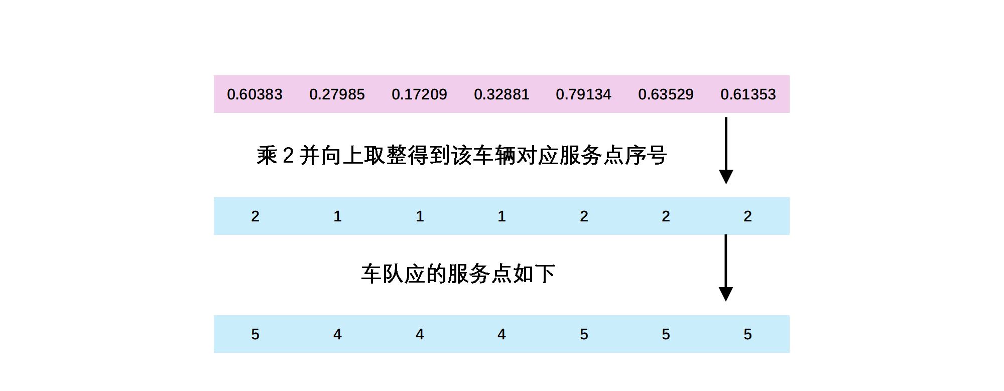 的数目2 ((1)中得出)并向上取整,得到备选车辆所选择开放的设施的编号,编号1、2代表开放的第一、二个候选设施