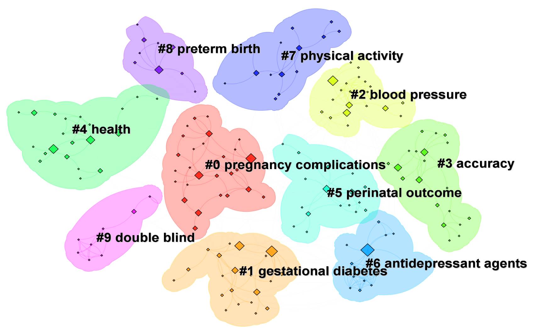 如图2所示,CNKI数据库中关键词聚类图谱中共出现14个聚类,分别为#0妊娠、#1孕妇、#2健康教育、#3优质护理、#4子痫前期、#5硝苯地平、#6妊娠结局、#7临床疗效、#8妊娠期、#9疗效、#10拉贝洛尔、#11血压、#12临床效果、#13血压控制。文献聚类热点主要集中在“临床效果”,“预防和治疗手段”,“相关指标”等主题。如图3所示,WOS数据库中关键词聚类图谱中共出现10个聚类,分别为#0 pregnancy complications (妊娠并发症)、#1 gestational diabetes (妊娠期糖尿病)、#2 blood pressure (血压)、#3 accuracy (准确性)、#4 health (健康)、#5 perinatal outcome (围产结局)、#6 antidepressant agents (抗抑郁药物)、#7 physical activity (体力活动)、#8 preterm birth (早产)、#9 double blind (双盲)。文献聚类热点主要集中在“危险因素”,“相关并发症”,“不良结局”等主题。