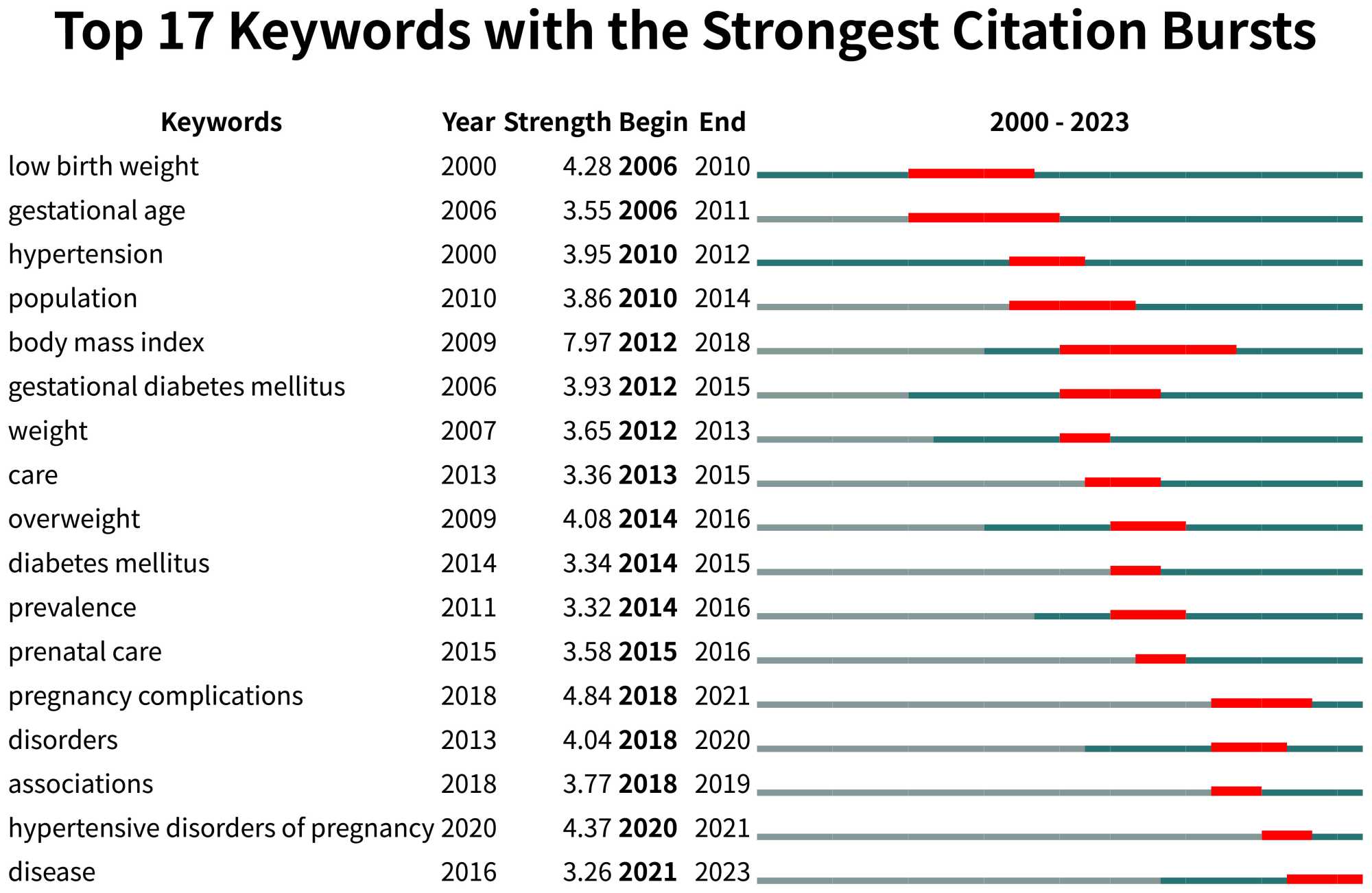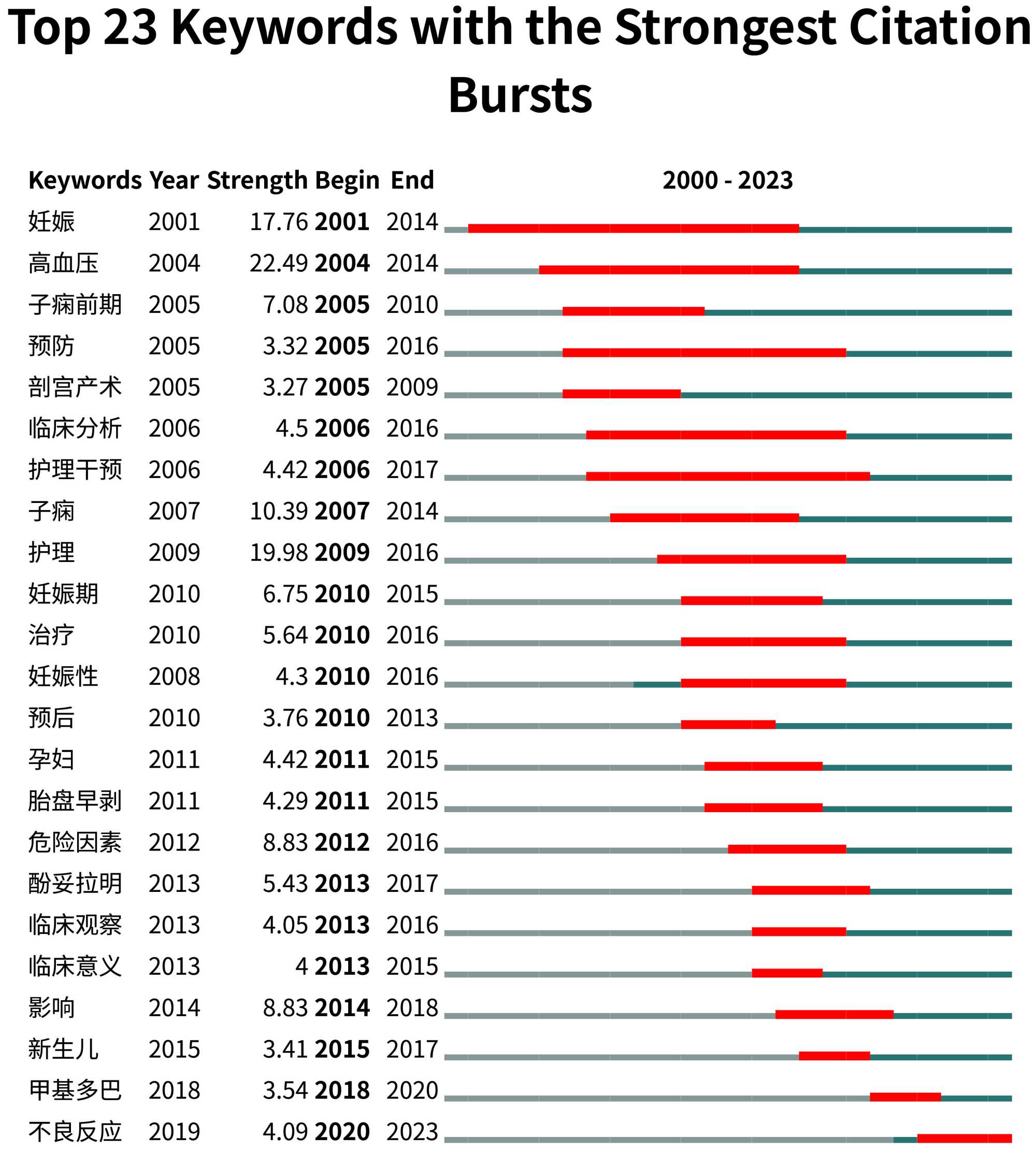 根据突现关键词和时区图谱结果显示,CNKI数据库和WOS数据库中研究热点均呈现出一定的演变趋势。在CNKI数据库中,早期研究聚焦于HDP的基础临床特征和药物临床治疗方案。随后,研究重心逐步转向影响因素探究,分析自然地理环境和社会因素在疾病发生发展中的作用。这包括了对特定因素的研究,例如,已有研究指出寒冷季节临产和长期暴露于PM2.5等污染物的孕妇患病风险更高[25] [26]。此外,孕前身体质量指数、年龄、家族史等个体因素也得到关注[27]-[29]。现阶段,研究趋势拓展至全面风险评估和多维度健康管理,以及孕产妇不良情绪带来的影响。同时,关注对患者的睡眠质量、自护能力等方面的探讨,并注重松弛训练等新型辅助手段和超声检查等监测技术。WOS数据库早期研究围绕相关风险因素及临床结局展开。随后,研究重心逐步转向代谢健康和心理社会因素。与此同时,人们认识到HDP是一个受到社会经济因素影响的公共卫生问题。现阶段,研究已进一步整合多层面风险因素,并关注母婴双方的长期健康效应。
