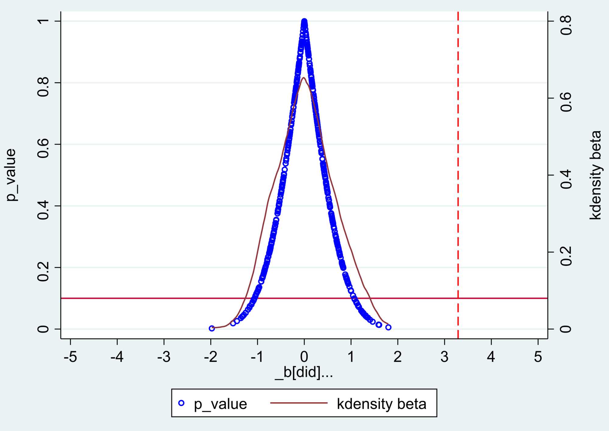 为进一步排除其它不可观测的因素对估计结果产生影响,确保基准回归结果的稳健性,本文参考Liu and Lu (2015)的做法[8],从所有样本城市中随机抽取与真实试点城市数等量的城市作为处理组。具体地,本文将大数据综合试验区虚拟变量随机赋值,基于式(1)重新回归,并将此过程重复500次。回归系数模拟结果如图1所示。由图1可知,随机模拟的回归系数集中在0点附近且多数散点在10%的水平上不显著,远小于基准回归中的3.289。这表明大数据综合试验区政策的确促进了企业数字化转型,排除了随机因素对结果的干扰。