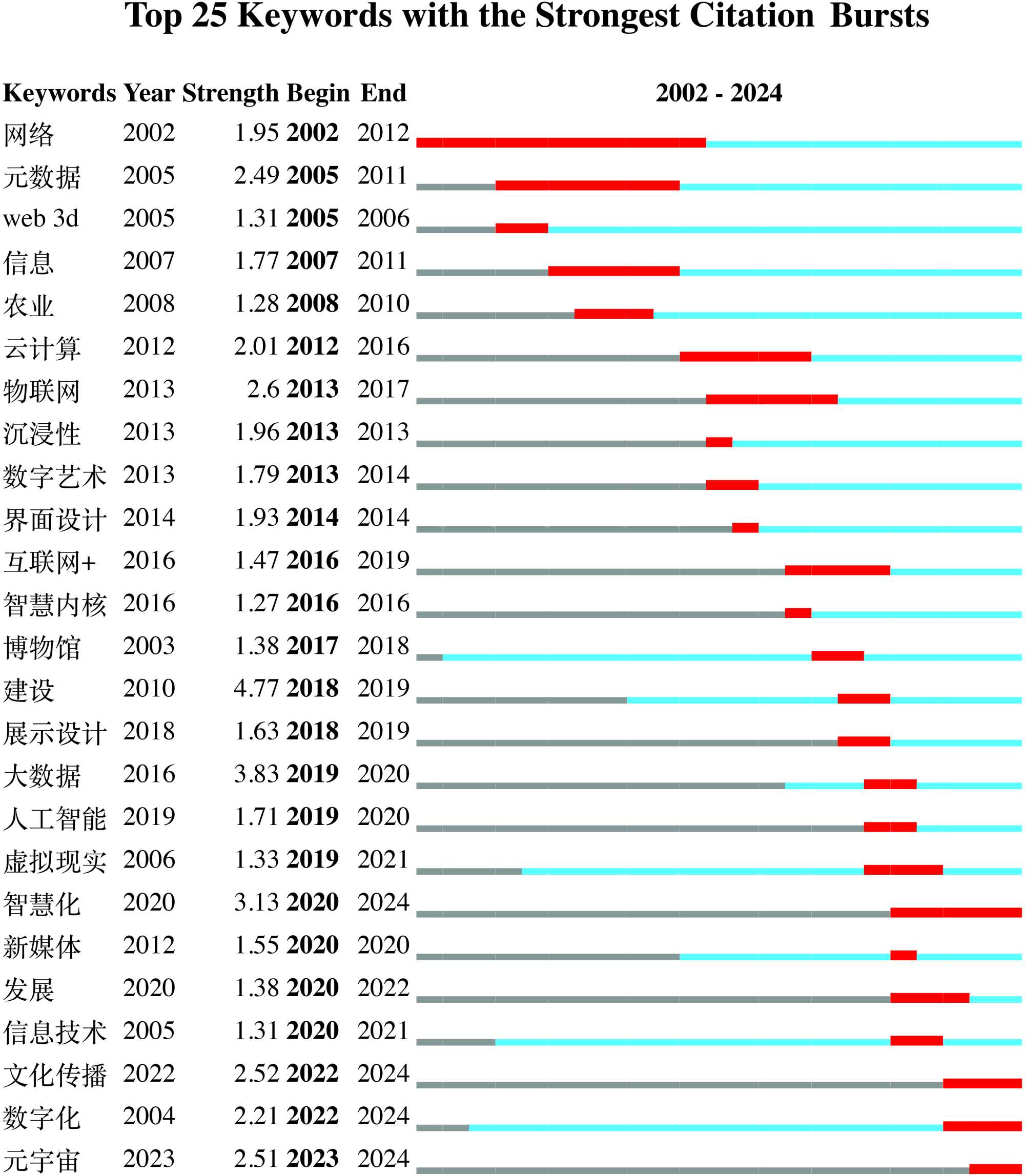 CiteSpace软件的核心功能之一是探测和分析学科研究前沿的历时性变化趋势以及研究前沿与其知识基础之间的关系[9]。“突现词”指在某一时段内被引频次骤增的关键词,突现词分析用于发现研究热点和学术前沿。通过和所展示的关键词时间线及突现,可清晰识别2002~2024年我国博物馆数字化研究的热点演进轨迹,可以将其分为以下三个阶段: