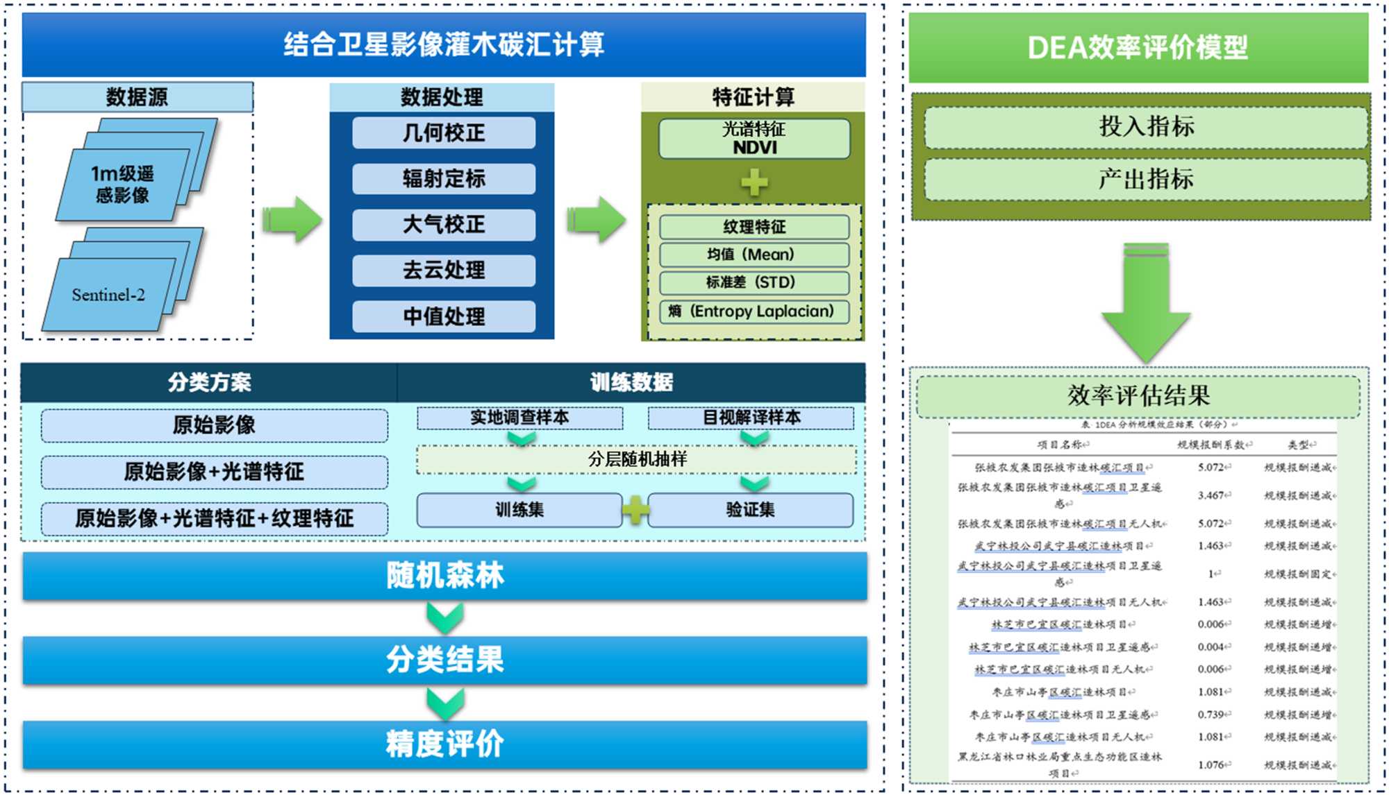 本研究通过融合多源卫星遥感数据与随机森林算法,构建了高精度、高效率的灌木林碳汇动态监测体系,显著提升了识别精度与碳汇估算能力。研究利用Sentinel-1/2遥感影像构建的智能分类系统,分类精度超过92%,并结合光谱–纹理–时序特征融合技术优化反演模型,实现了灌木生物量的高稳定性估算;同时,通过DEA经济效率分析验证了卫星遥感监测在技术效率与成本效益上的全面优势,为规模化碳汇项目管理提供了科学依据。