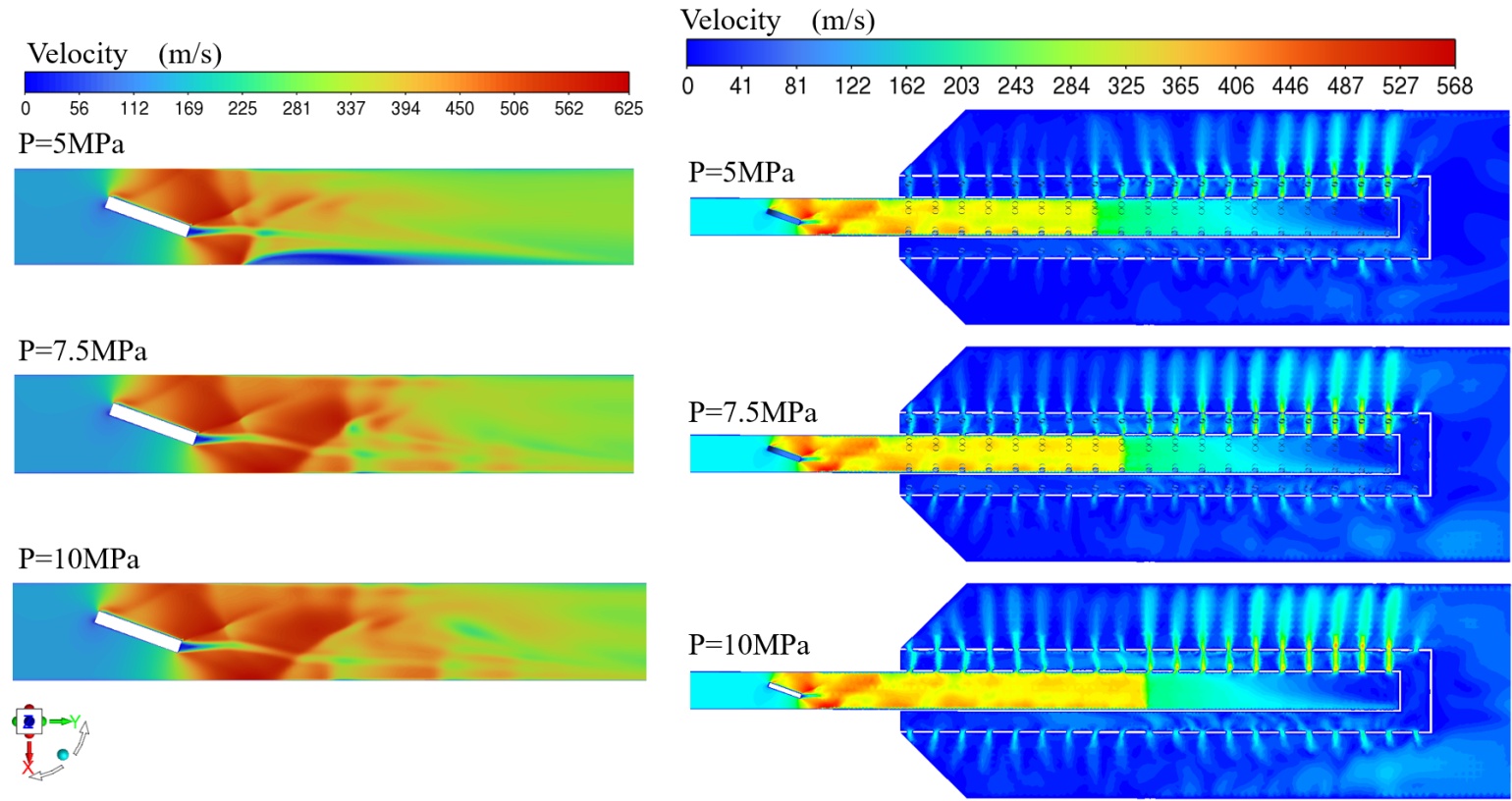 在保持恒定的出口压力(1 Mpa)和蝶阀开度(70%)条件下,研究入口压力以2.5 MPa的梯度从5 MPa增加到10 MPa对流场及声学特性的影响。通过对流道对称面速度场分析,如图7所示,两种模型呈现不同的高速流动特征。蝶阀在节流口处因截面收缩形成高速射流,阀后出现显著速度梯度。其高速区分布于节流口及出口段,最高流速达625 m/s。蝶阀加消音器节流后高速区分布更均匀,集中于节流口、出口段及消音器套筒与小孔处,最高流速568 m/s,较蝶阀降低约9.1%。两种模型的流速极值均出现在碟板与管道间隙的狭窄区域。对比表明,蝶阀加消音器可有效降低局部流速峰值,有助于改善系统气动噪声特性。