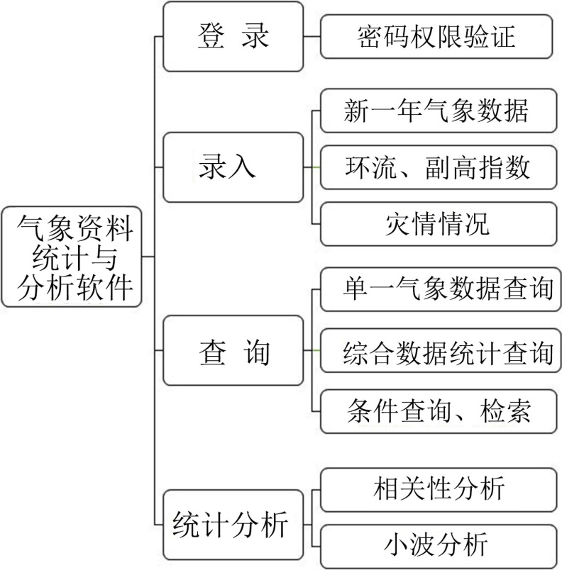 结合前面对软件系统功能需求分析,本软件系统能够分成登录模块、数据录入模块、数据查询检索模块以及气象数据统计分析(小波分析)模块[9]-[14]。本软件结构如图2所示。