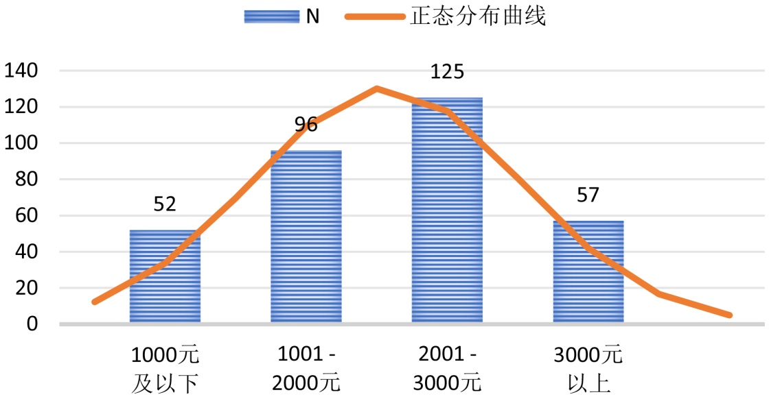 图6展示了本次调研中受访者月可支配收入的分布情况,通过柱状图和正态分布曲线可以看出,收入在2001~3000元和1001~2000元的受访者占比较高,1000元及以下和3000元以上的受访者数量相对较少,整体呈现出中间高、两侧低的分布形态,呈近似正态分布。这种收入分布表明膨化食品市场的主要消费群体集中在有一定消费能力的中等收入人群。