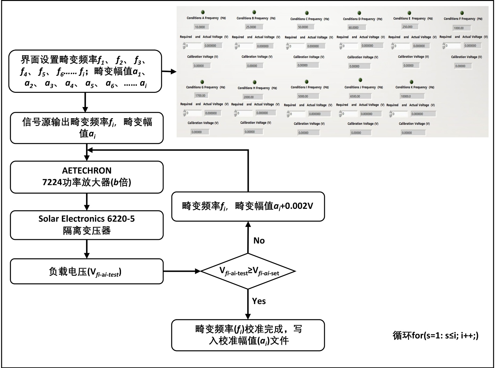 图3为电压畸变频谱的校准过程框图,图4为电压畸变频谱的测试过程框图。测试系统校准前需要在界面之中输入对应的畸变电压校准值,随后便开始校准。校准开启时,测试系统设置信号源为指定输出正弦信号的频率(f1)以及幅值(a1),当波形发生器注入到校准负载上的电压达到校准电压值时,该频点的电压校准已完成,校准幅值会写入校准文件之中;随后测试系统控制信号源输出下一个畸变信号的频率(f2)以及幅值(a2),按照与上一个频点校准同样的要求校准该频点,直至所有频率校准完成;校准完成之后,测试系统会在相应的文件之中写入实际校准的电压幅值以供测试系统调用。