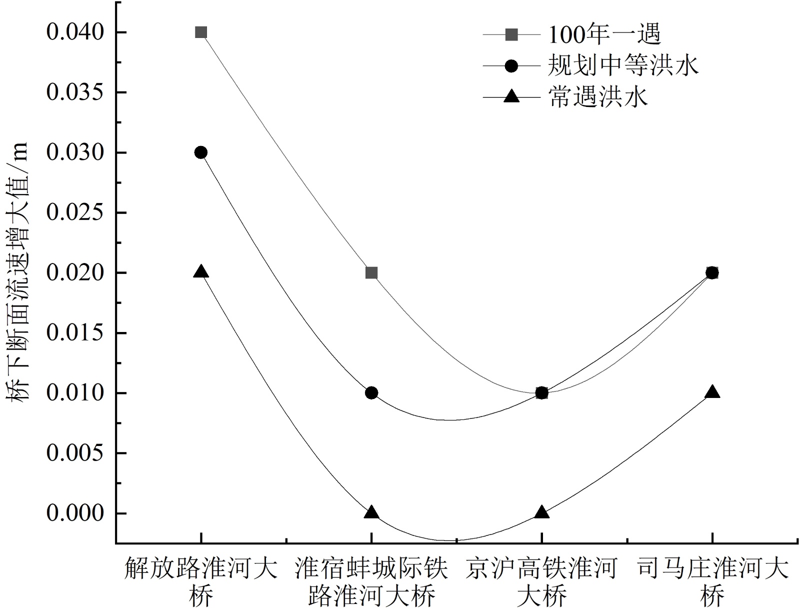 不同工况下各个桥梁的断面平均流速模拟成果如表5所示。通过对比桥梁上游断面与桥下断面的平均流速差可知,水流经过桥址处的流速都会略微增大,桥下断面平均流速增幅均在0.04 m/s以内。由图4可知,随着防洪要求的提高,河道内流量的增大,断面平均流速差值呈增大趋势。三种工况条件下,断面平均流速的最高值均出现解放路淮河大桥,其中在100年一遇工况下断面平均流速差值达0.04 m/s。在实际工程应用中,桥下断面水流速度的大幅增大,会使得桥梁处水流裹挟泥沙的能力也随之增大,这将会造成桥下断面河床的冲刷,因此在桥梁工程建设时应重点考虑大洪水流量条件下桥梁断面平均水流速度的变化。