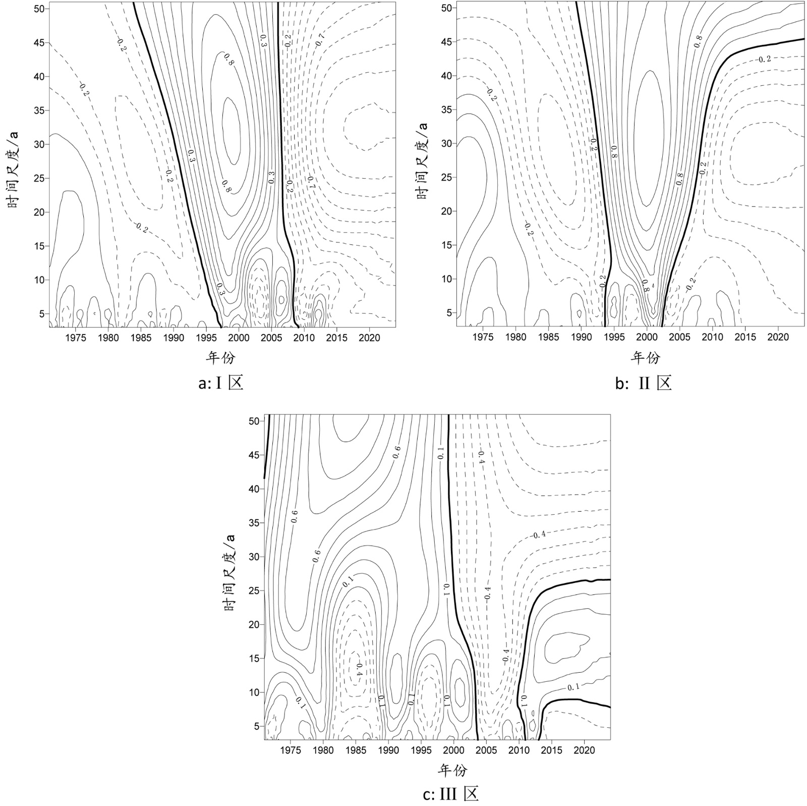 甘肃中部地区年Ts-Ta存在显著的周期性变化特征。对1971~2024年甘肃中部不同区域年Ts-Ta进行Morlet小波分析并绘制图4(a)~(c),可以看出,在时间尺度20~25a层次上,I区、II区均完成2个振荡期,即“+ − + −”;在时间尺度15~20a层次上,III区完成2.5个振荡期,即“+ − + − +”。另外,I区和II区存在5a左右的短周期,III区存在8a左右的短周期。目前,I区和II区均处于偏低期,III区处于偏高期。这种差异可能与东亚夏季风的周期性振荡有关[19]。