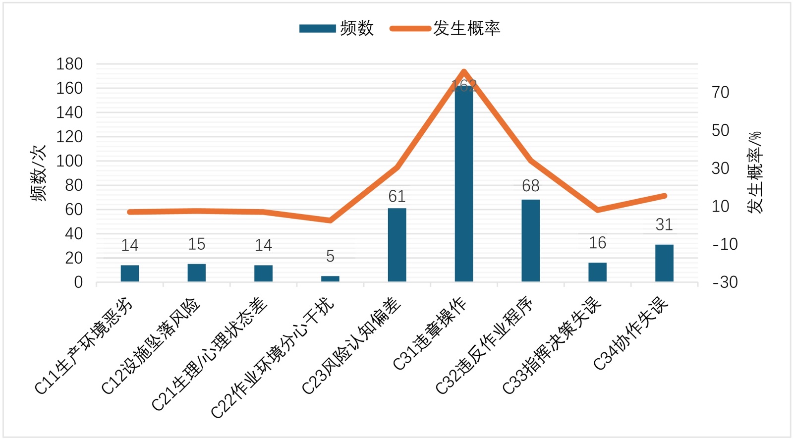 分析表明,单起事故多由多重致因耦合导致,致因因素的累计发生概率之和远超100%。如图2所示,近端行为层(C层)因素的累计发生概率高达193% (即386/200),表明平均每起事故涉及1.93项人因或环境失效。其中,人因相关因素(C2人员状态与C3人员因素)是主要贡献源,占比达178.5% (357/200)。这一高频次现象印证了事故rarely由单一因素引发,而多是多种因素(如违章操作与风险认知偏差)叠加的结果。具体而言,违章操作(C31)是绝对主导因素,发生概率为81.0%,其具体表现主要包括安全装备误用和无证作业等。