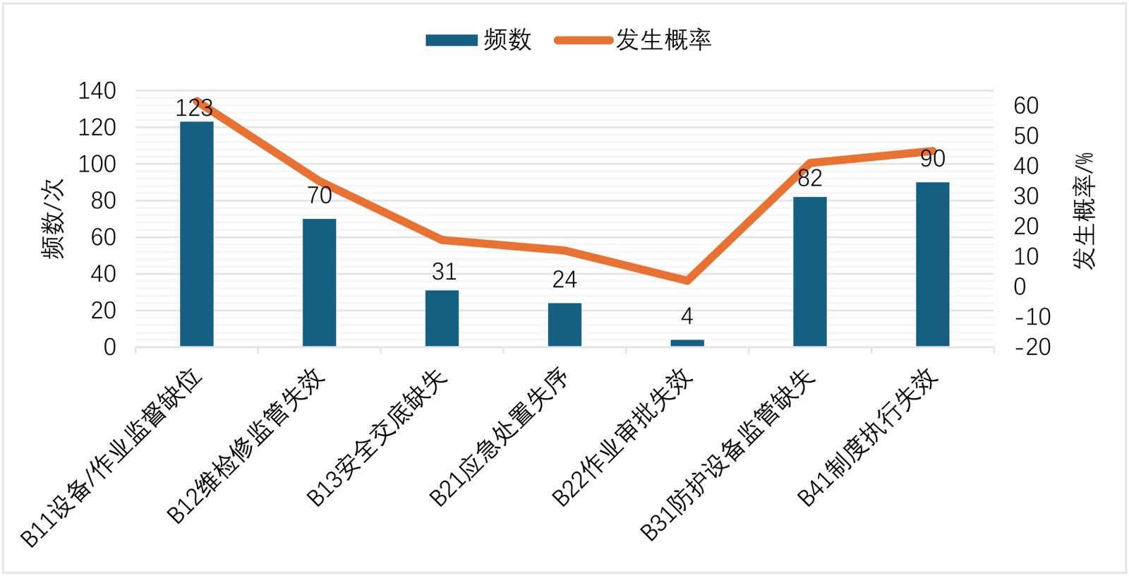 如图3所示,监督层中最突出的问题是B11 (设备/作业监督缺位),发生概率为61.5%。其次依次为B41 (制度执行失效) (45.0%)、B31 (防护设备监管缺失) (41.0%)和B12 (维检修监管失效) (35.0%)。