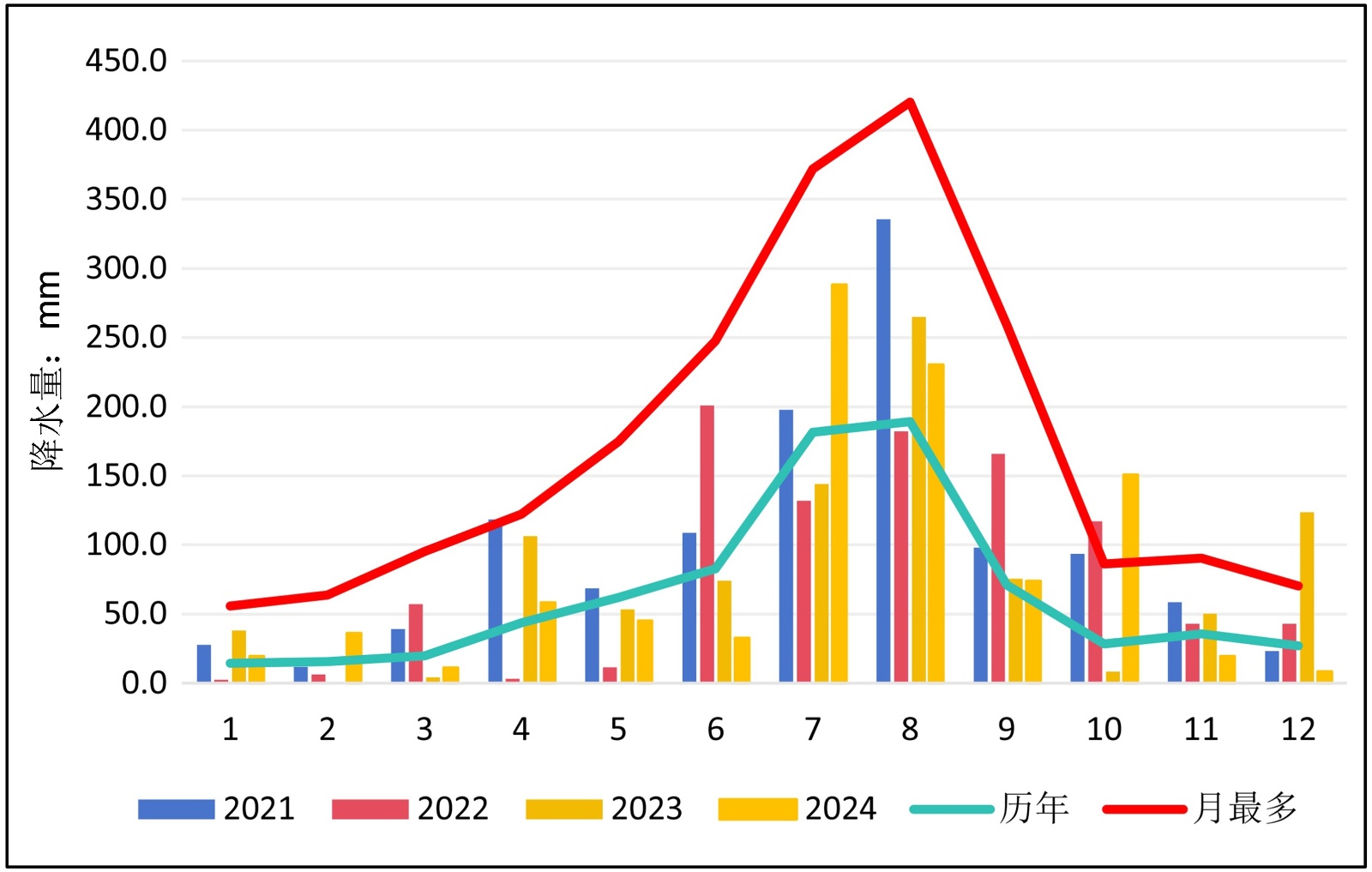 由图3可知,降水主要集中在6~9月,其中2021年4月降水量为历年4月最多降水量;2022年4月降水量为历年4月最少降水量;2023年2月无降水,为历年2月最少降水量;2024年10月降水量为历年10月最多降水量。