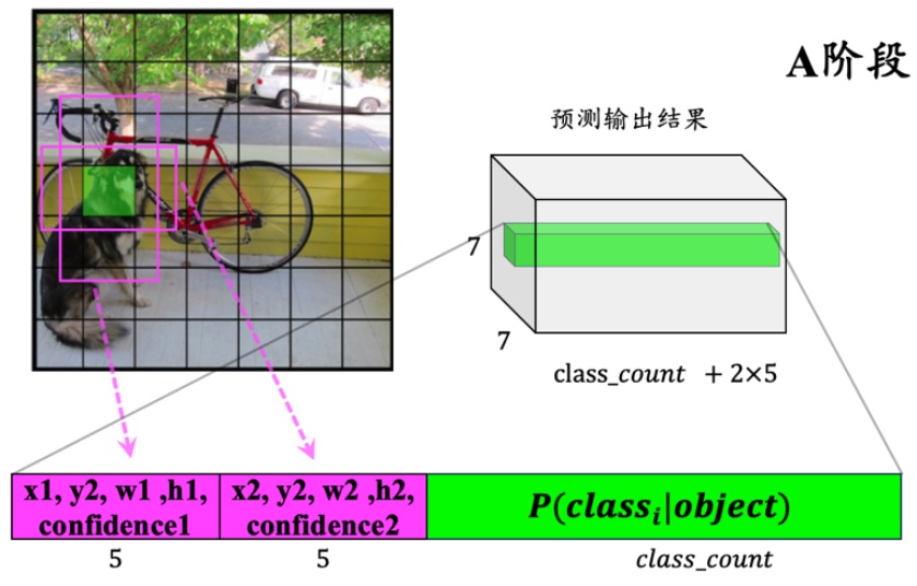 个值来完成定位和分类任务,也就是将目标检测任务转化为了深度学习中的回归任务。完成这一回归任务依靠复杂的卷积神经网络,YOLOv1用了GoogleNet,v2版本用了DarkNet19,v3,v4,v5主要采用了DarkNet53及其改进版,通过这些卷积网络可以得到一个含有全部预测框位置和类别信息的张量,即A阶段,见图1。