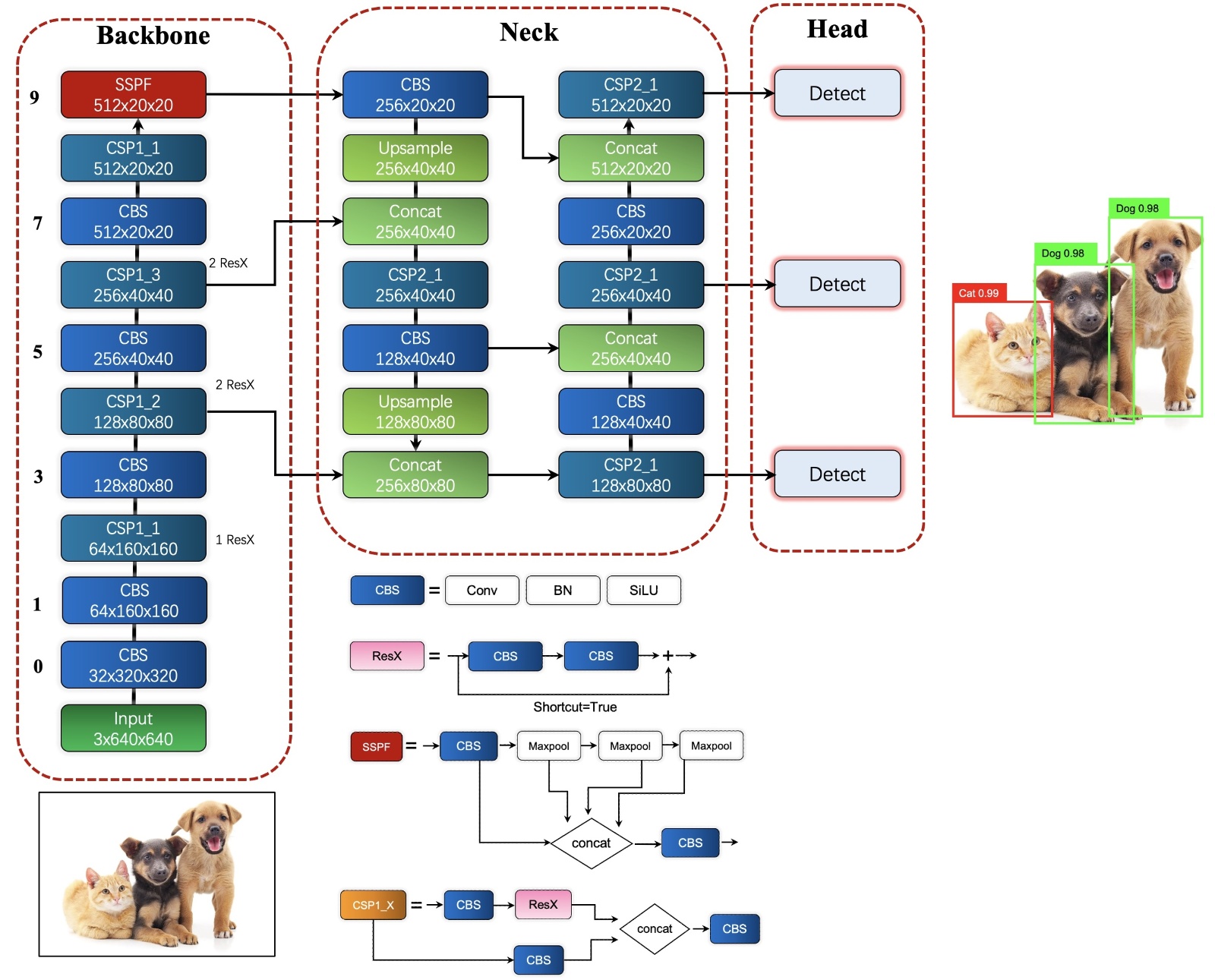 另外,YOLOv5还首次采用了letterbox自适应缩放技术。早期版本通常将输入图像强制缩放到统一尺寸,导致目标形态发生畸变或信息丢失。而letterbox缩放通过保持原图纵横比进行等比例缩放,并在空余区域填充灰色像素补齐至指定尺寸,既保证了网络输入的一致性,又最大限度保留了图像的有效信息,从而进一步提升了检测的准确性和稳定性,其网络结构见图2。