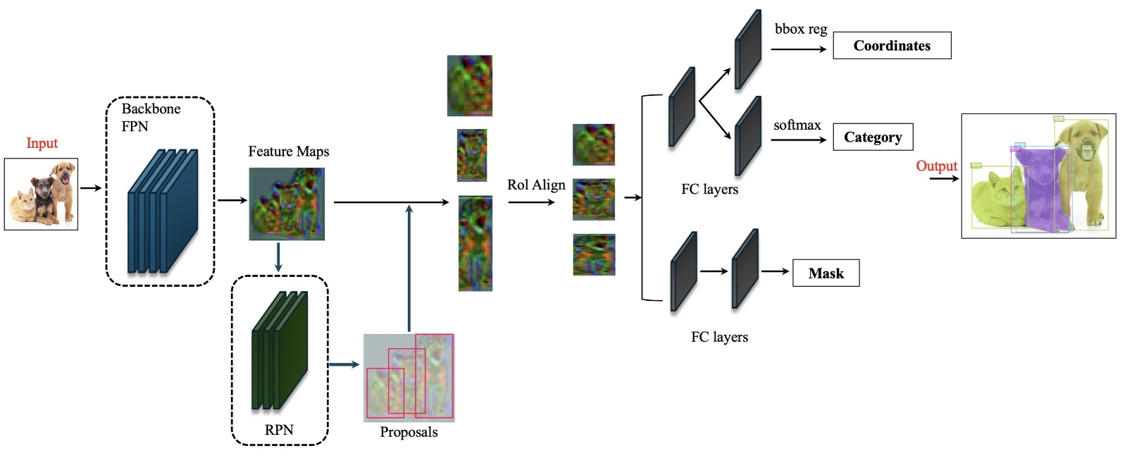 另Mask R-CNN是一个二阶段的目标检测算法并且还能完成实例分割任务,由Kaiming He等人[12]提出,其在COCO数据集实例分割任务上取得了很好的效果,领先于其他实例分割模型。其主要在先前的Faster R-CNN的基础上加入了用于实例分割的分支网络预测掩码,该分支和现有的分类和边框回归并行,添加了该分支仅仅增加了很小的运算负担。该分支将区域建议网络得到的ROI align输入一个小型的全卷积网络FPN中,输出该区域图片的二进制掩码,且对于每一个类别独立预测其掩码,使用的是Sigmoid和二元交叉熵损失函数(Binary Cross-Entropy Loss),这样避免了多个类别彼此竞争。最后实例具体是哪一个类别由分类分支的结果决定,此时输出该预测类别的掩码。而对于每一个实例的类别和对应预测框的预测一般通过ResNet或ResNeXt网络进行预测。所以Mask R-CNN共输出三个结果:预测类别、预测框和掩码,三部分组合得到我们想要的结果,也就是带有掩码和类别的图片。Mask R-CNN的优势在于像素级别的实例分割和精细化特征对齐,这使它在处理粘连、重叠的目标时更准确、更鲁棒,见图3。
