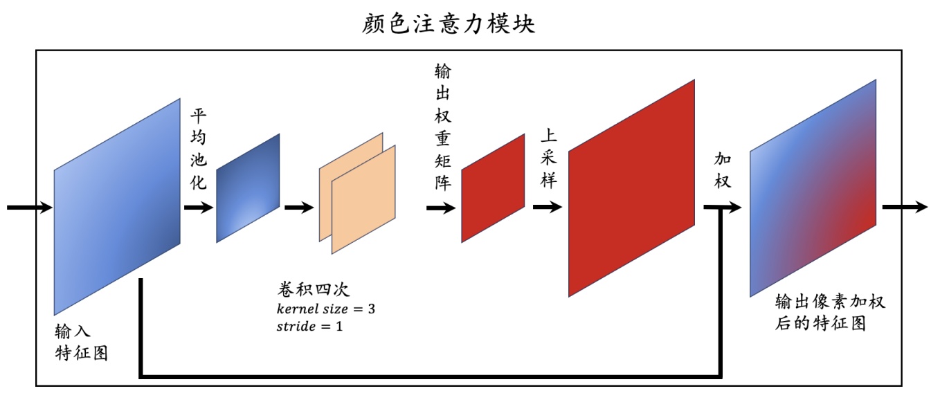 通常在进行血细胞计数前,都会人为对血细胞进行染色,以便更好的用显微镜观察。而不同种类的血细胞在染色后会呈现不同的颜色和纹理特征,比如白细胞的颜色相对红细胞更深,红细胞由于其双凹盘结构中心颜色较浅接近于背景色,相比让神经网络盲目通过训练来寻找特征,我们可以让模型在训练过程中主动更加关注血细胞的颜色特征,使其更快收敛,降低了计算成本,也可以提高血细胞识别分类精度。为了实现让模型提高对颜色特征的关注度,本文提出了颜色注意力机制,并该模块其加入到YOLOv5的主干网络中,其内部结构如图4:
