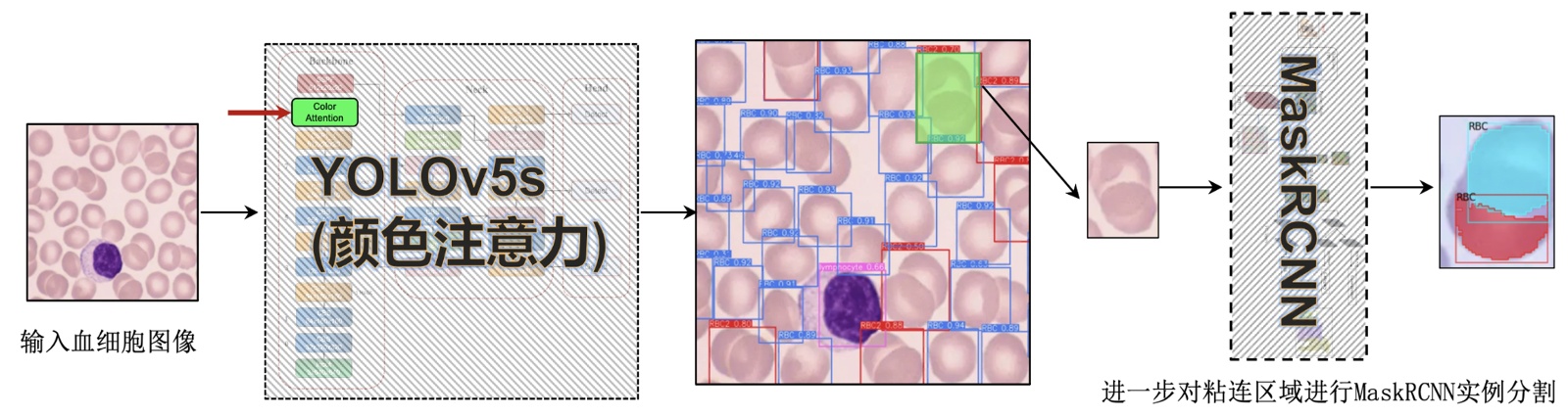 本文主要内容是使用带有颜色注意力机制的YOLOv5模型对血细胞进行目标检测,同时对于粘连重叠的红细胞,单独对其所在区域进行实例分割。因为Mask R-CNN是多阶段的目标检测算法,其首先要利用RPN网络生成图像中感兴趣的区域,然后再利用卷积神经网络进行特征提取,最后还要生成掩码,其速度非常慢,所以主要的血细胞计数和检测任务交给YOLO算法完成。