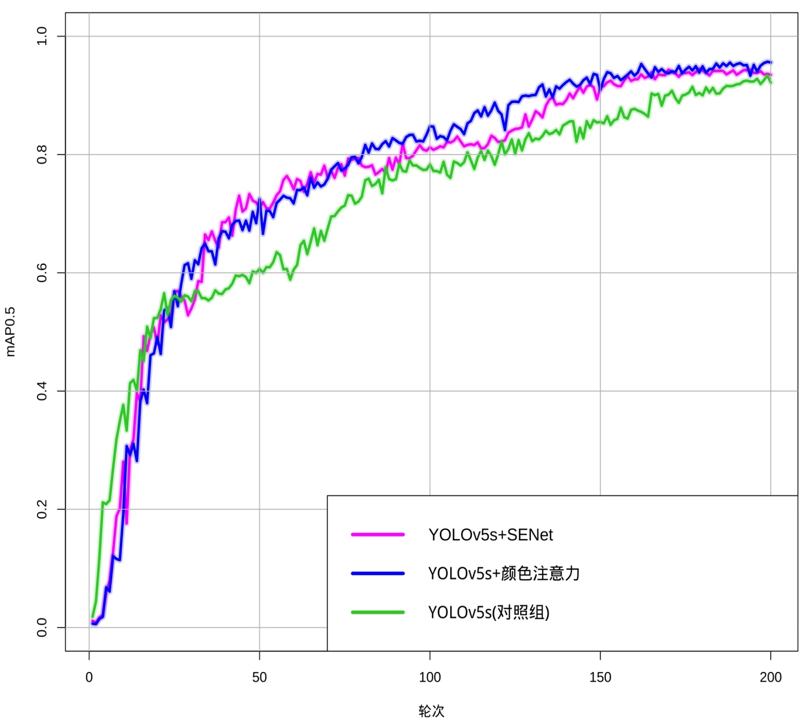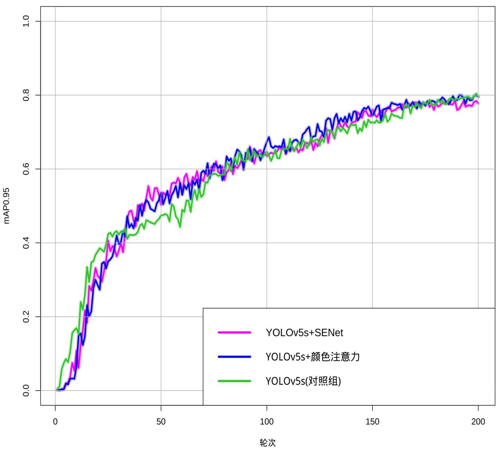 在很多文章中对YOLO算法的目标检测模型改进加入了SENet通道注意力机制(Squeeze-and-Excitation Networks) [13],通过引入压缩激励模块,自适应地重新加权每个通道的特征,提高网络的表示能力和分类性能。具体来说,SENet通过全局平均池化压缩每个通道的空间信息,然后通过全连接层和Sigmoid激活函数生成每个通道的权重,这些权重用于调整原始特征图,使得网络更关注有用的特征。本文也将其加入实验进行对比。实验分为三组,对照组为普通的YOLOv5s,实验组一为YOLOv5s + SENet (通道注意力),实验组二为YOLOv5s + 颜色注意力模块,实验组三(对照组)为原始YOLOv5s模型。训练200轮后,图8为实验结果。