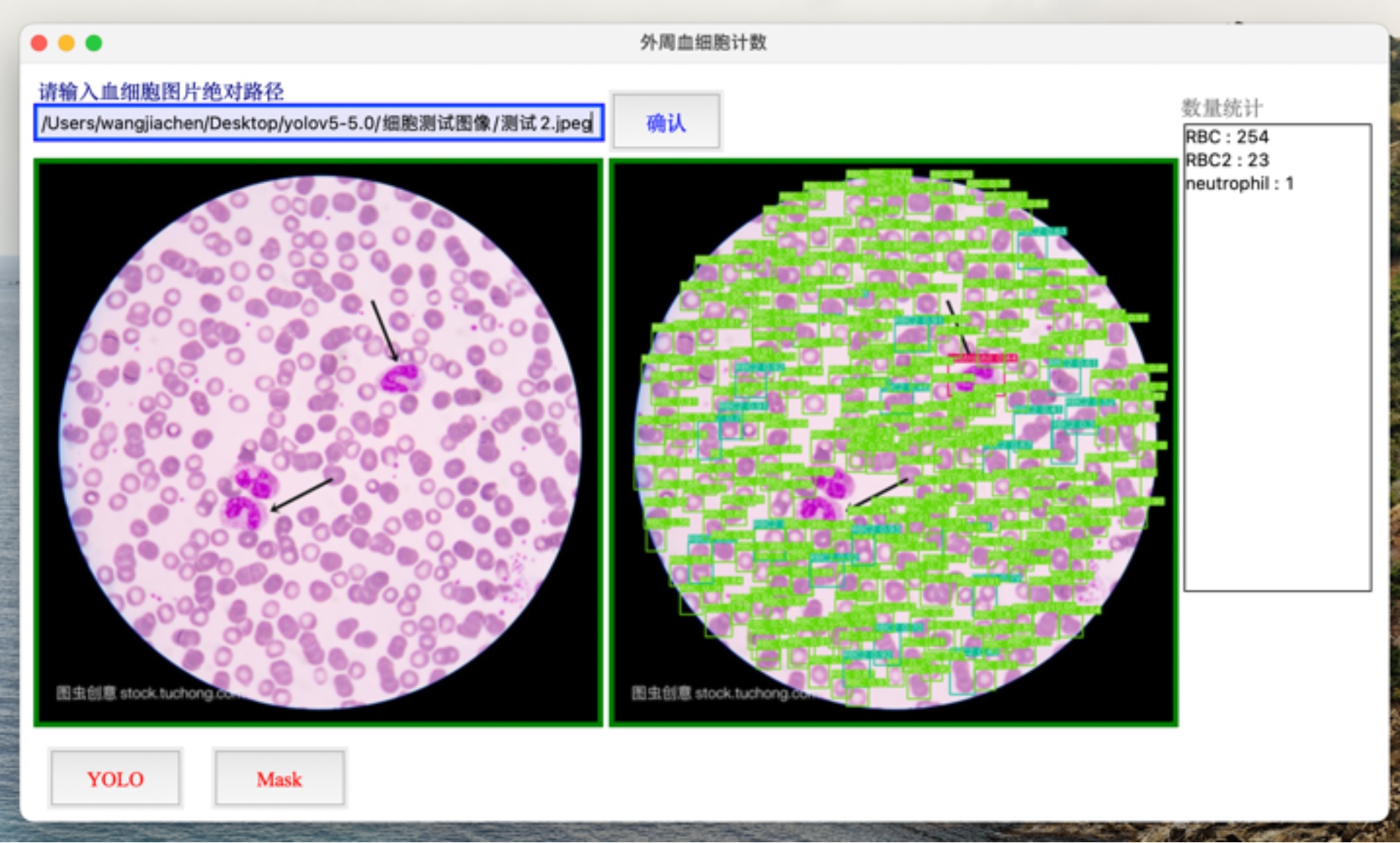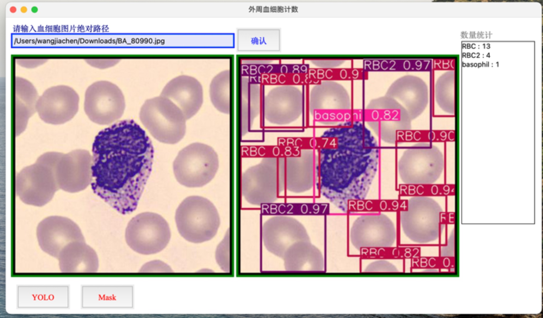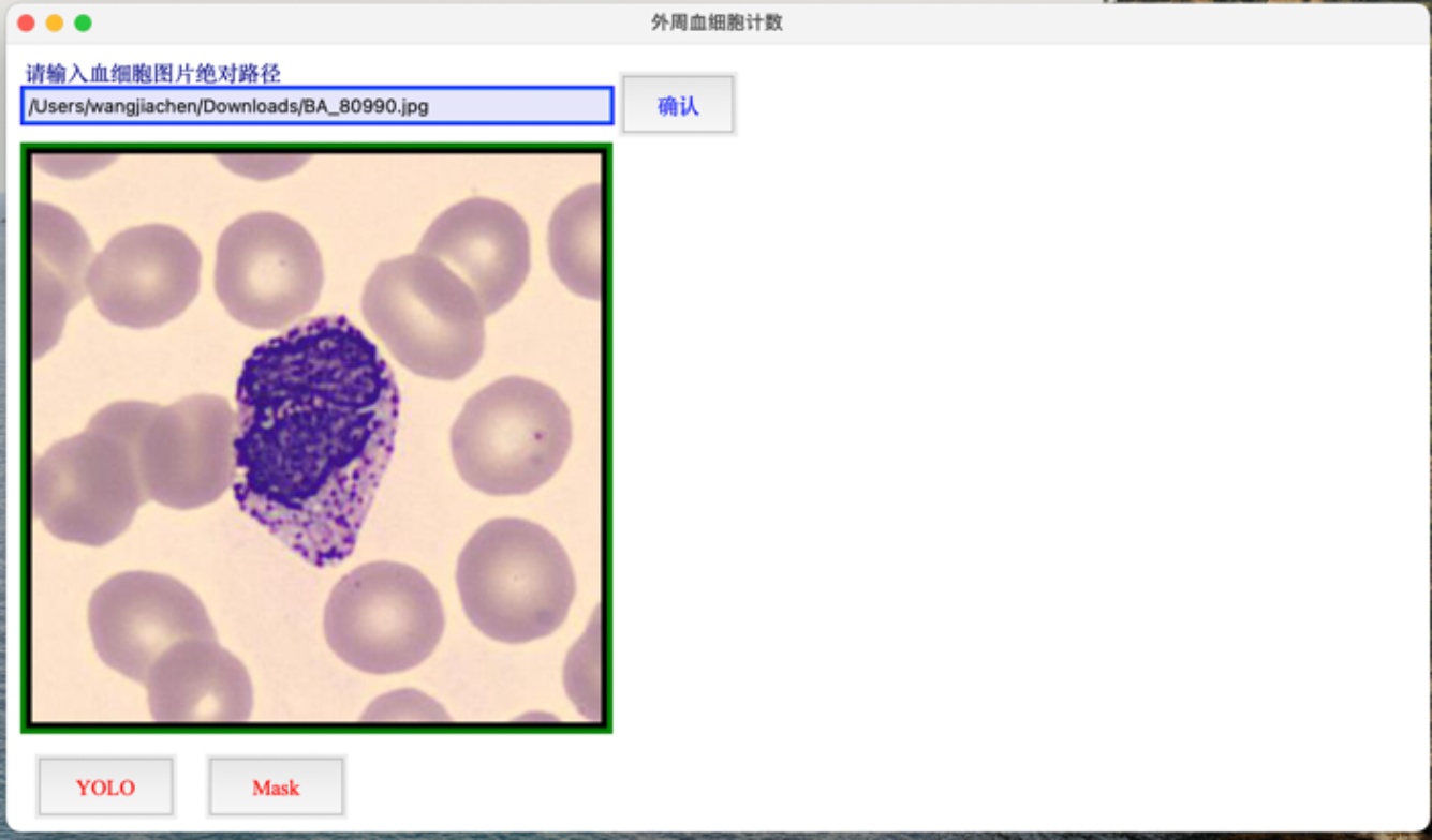 该桌面应用可以在不同操作系统下运行,程序全部代码以及两个模型文件已上传到github中,https://github.com/JiachenWong/Blood-Cells-Count-YOLO-MaskRCNN
