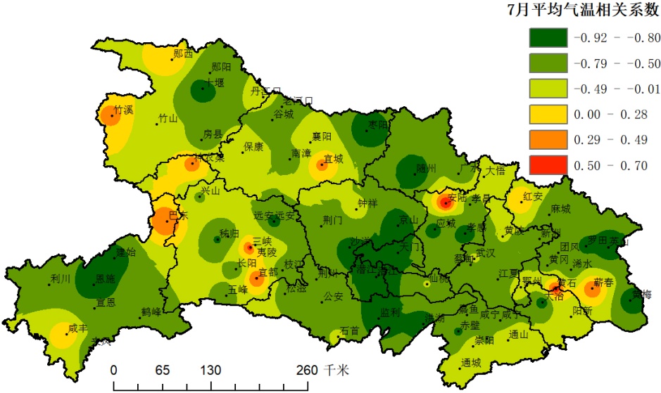 7月相关系数最大的站点出现在恩施,处在鄂西南,其相关系数为−0.92。方程为y = −5.199x + 165.1,R2 = 0.849。计算结果比实况显著偏差。因此CLDAS温度插值在该站点参考性不大。