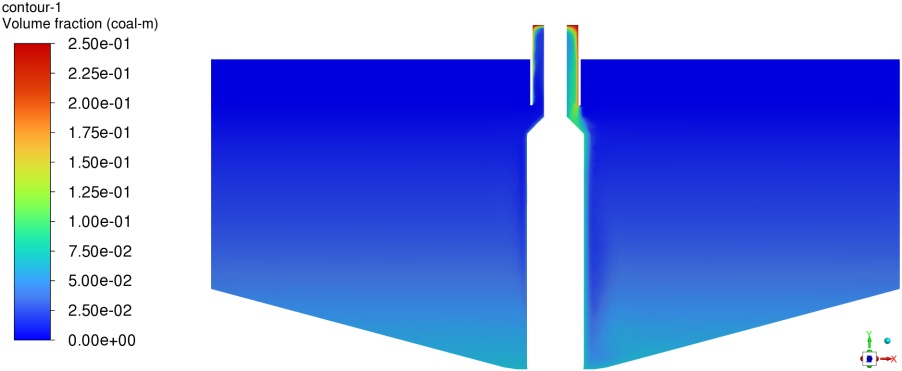 在沿Y轴方向上设置重力加速度为−9.81 m/s2,多相流模型采用Mixture模型,并设置相数为3相,湍流模型选用Realizable k-ε模型。参与仿真计算的介质为水、煤泥颗粒和空气。在Fluent材料库中水选择water-liquid (h2o < l),煤泥颗粒选择coal-hv-volatiles (hv_vol),密度设置为1800 kg/m3,粘性根据经验可设置为0.001167 kg/(m·s) [13],空气选择材料库中的air选项即可。相的设置方面,将水定义为主相,煤泥颗粒与空气分别作为第二相与第三相。