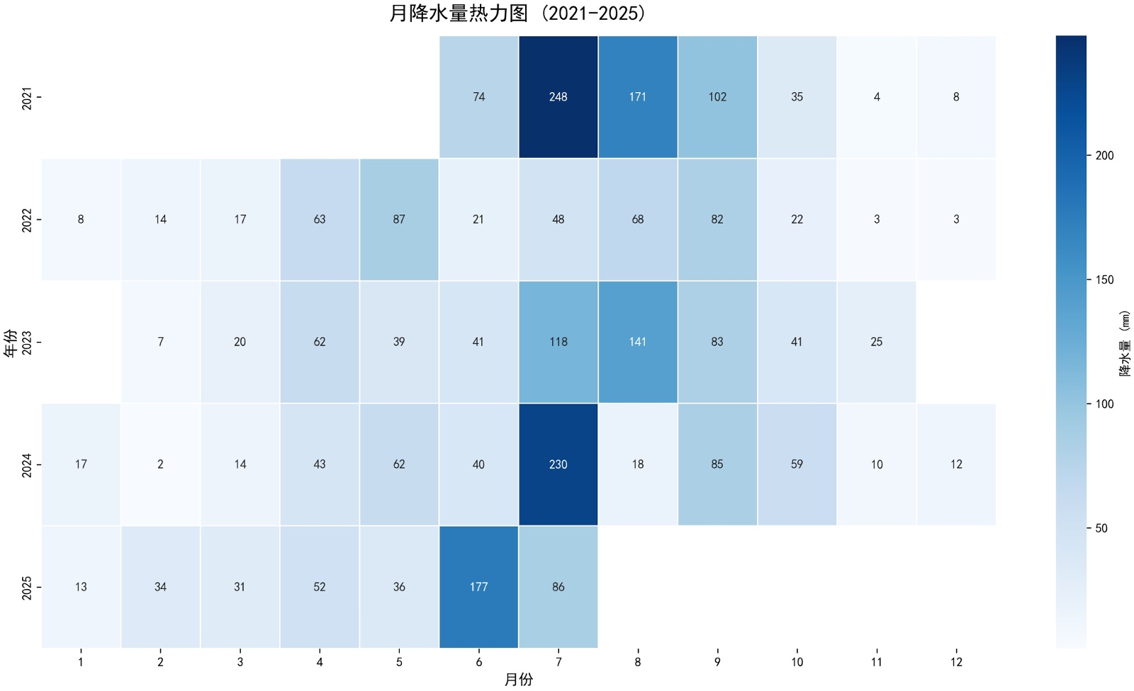 图1. (a) 天府机场2021年~2025年年总降水量及降水日数分布;(b) 天府机场2021年~2025年逐月降水量分布热力图
