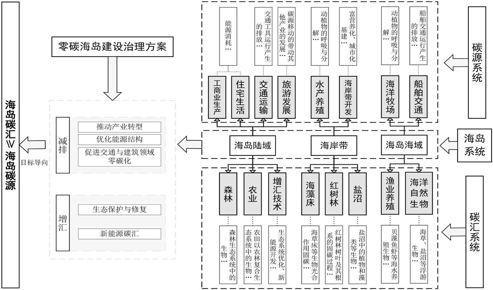 一个具备普适性、综合性和完整性的理论分析框架,厘清系统形成的内在机理,清晰界定系统边界与变量,是科学测算、预测碳系统变化以及进行碳减排与碳汇的基础,更是学界研究资源利用系统碳效应共同努力的重要方向。本研究聚焦海岛零碳建设,构建了以碳源–碳汇系统为基础、实施路径为支撑的协同架构,深度锚定“零碳海岛”的目标导向,将陆地生态碳循环与海洋蓝碳循环理论相融合。
