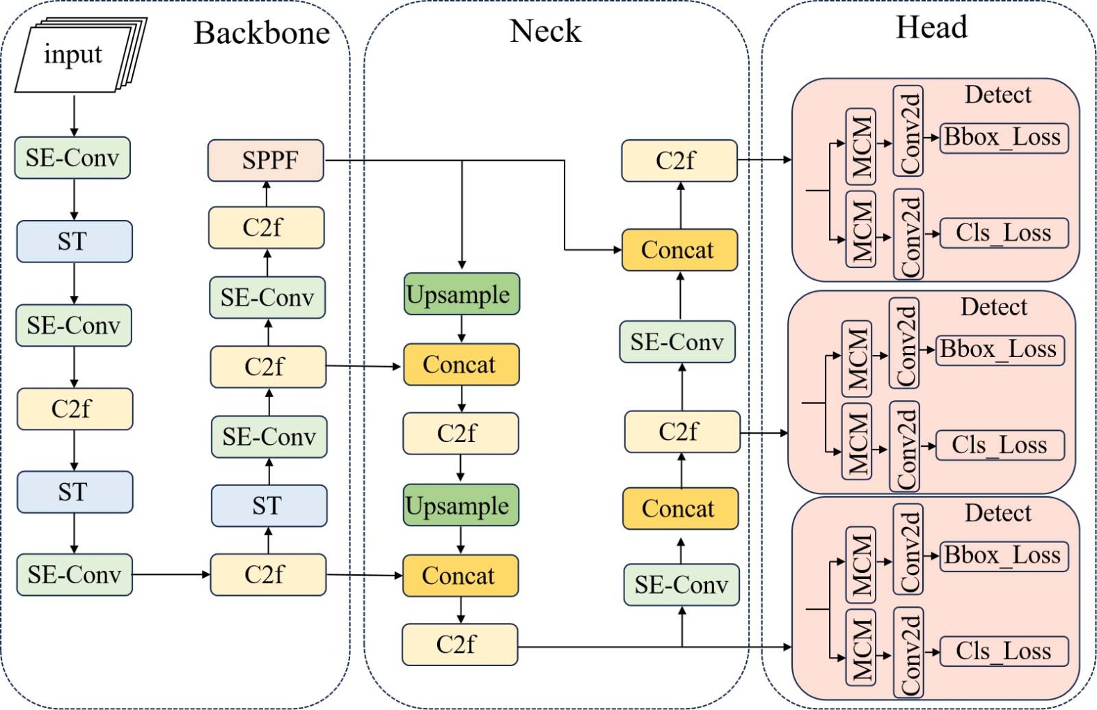 针对上述问题,本文提出了一种改进YOLOv8的行人检测模型Swin-YOLO,Swin-YOLO在最大程度保持YOLOv8原有结构的基础上进行了改进:首先,本文提出了一种基于通道注意力机制的SE-Conv模块,该模块通过将通道注意力SE-Net [7]与标准卷积块进行深度融合,有效增强了模型对关键特征的关注能力。其次,为了提升模型长距离建模能力,使其充分融合上下文信息,引入了Swin Transformer [8]并优化,提出了ST (Swin Transformer, ST)模块。最终,在模型的输出端构建了基于深度卷积[9]和空洞卷积[10]的多尺度卷积模块(Multi-scale Convolution Module, MCM),通过增加网络宽度并集成不同尺寸的卷积核,实现高效多尺度特征融合。该设计在保持较低计算复杂度的同时,增强了模型对多尺度特征的提取能力,提升了特征表达的多样性和鲁棒性。