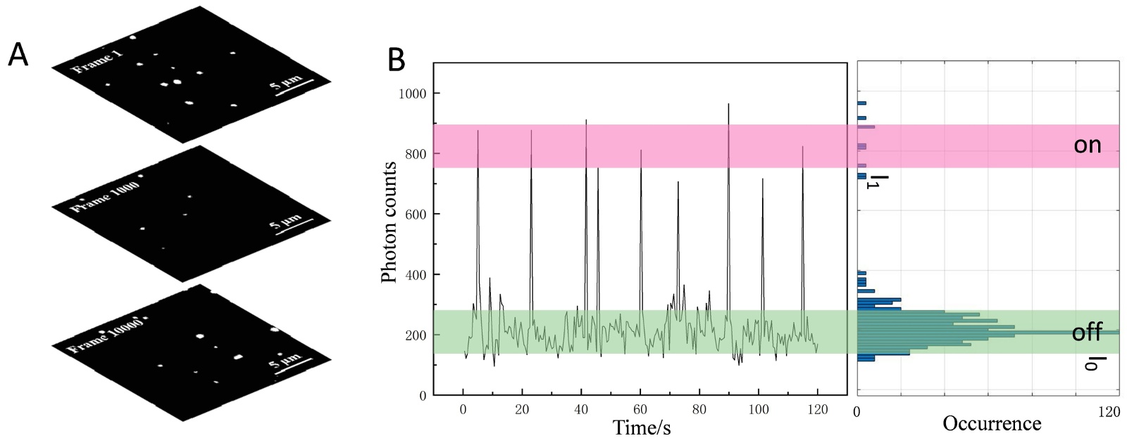 图3. QDs的闪烁特性。(A) QDs培养物连续10,000帧的成像图。(B) 修饰后的QDs的闪烁表征图