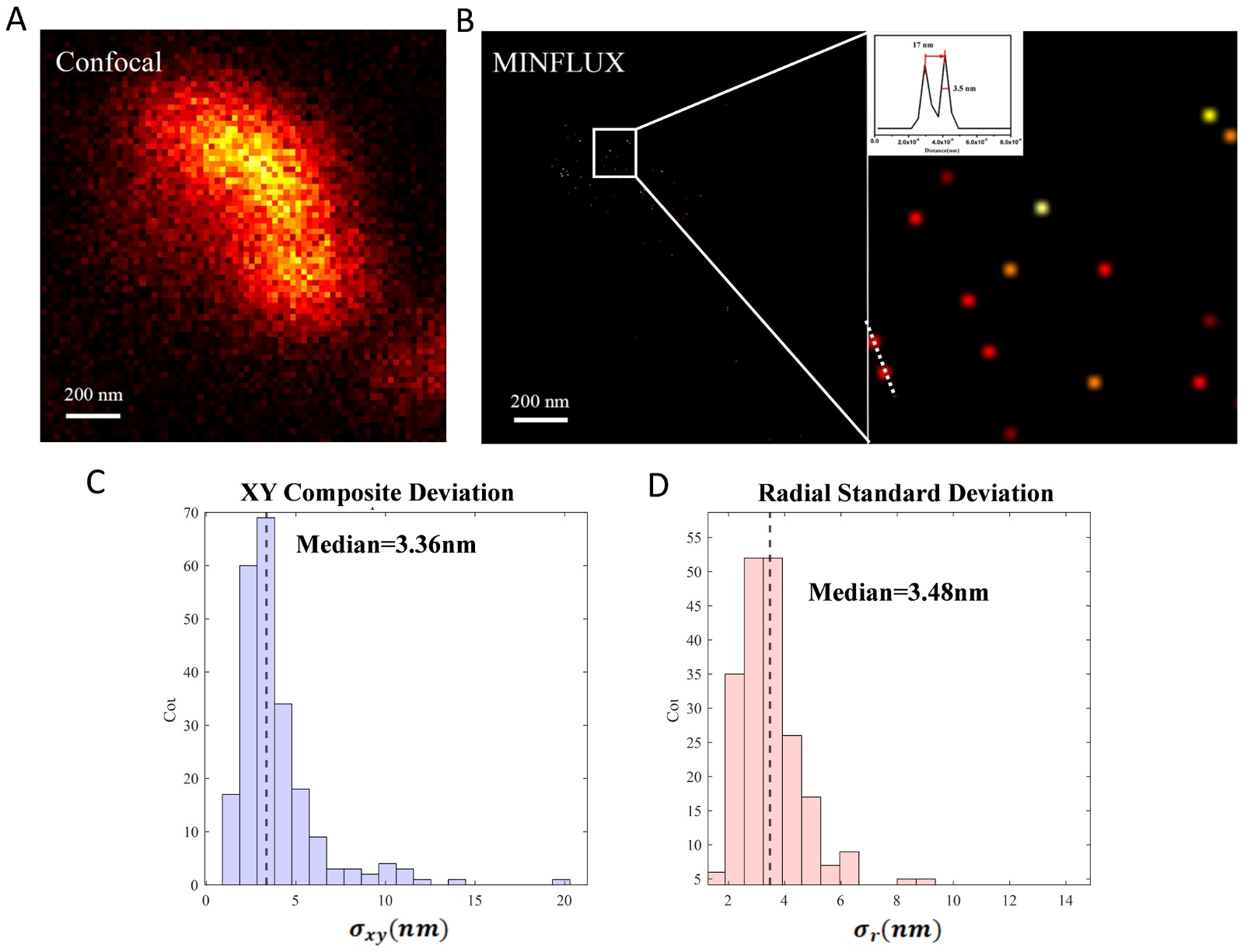 实验数据由Abberior MINFLUX显微镜(Abberior Instruments)结合Imspector软件采集并处理。每组MINFLUX成像数据均通过Imspector软件导出,所得数据文件包含全部有效定位事件的参数记录,同时保留了因信号质量不足而被排除的无效定位尝试的相关信息。
