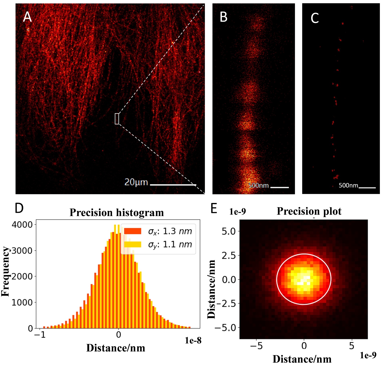 图5. QDs标记微管的MINFLUX成像结果。(A) 微管最大区域显示图。(B) 选取区域图。(C) MINFLUX对选取区域的成像图。(D) 显示σx = 1.3 nm, σy = 1.1 nm。(E) 定位精度图