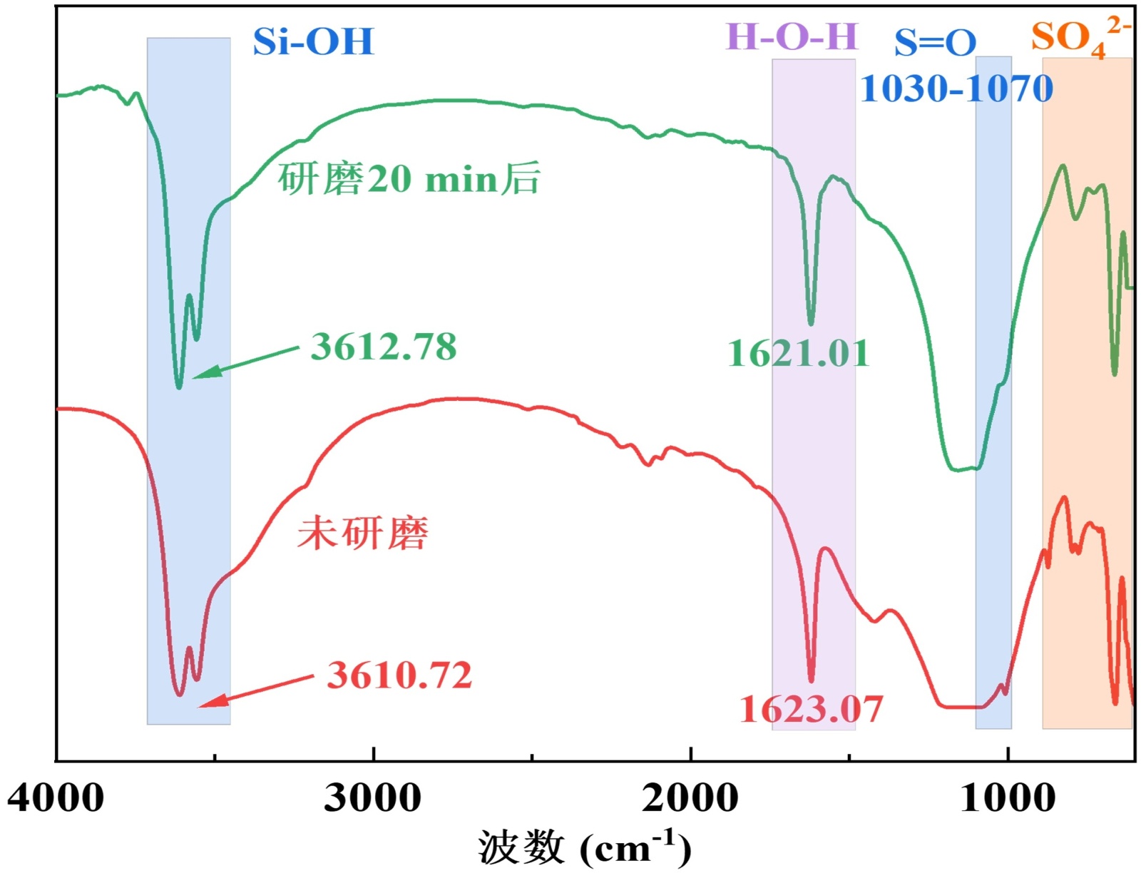 研磨前后酸洗磷石膏红外光谱如图6所示。在3400 cm-1附近出现的宽化吸收峰归属于O-H键的伸缩振动,主要源于磷石膏中残留的结晶水与表面吸附水。在1623 cm−1及1070 cm−1附近的吸收峰分别对应H-O-H的弯曲振动及S=O的不对称伸缩振动,是二水石膏的典型特征。经研磨处理后,这些特征峰的强度均呈现一定程度的减弱,尤其是在1070 cm−1附近的S=O键振动峰出现了宽化,这表明研磨过程中的机械力作用导致了二水石膏晶体结构的破坏,石膏的结晶度下降。600 cm−1及670 cm−1附近,此区域对应于SO42-的弯曲振动模式。研磨后的光谱在此处不仅峰强发生变化,其峰形也展现出更为复杂的特征,暗示硫酸根离子的局部化学环境因晶格畸变和缺陷的产生而发生了改变,有效地破坏了其晶体结构的完整性,诱导了结晶度的下降和晶格缺陷的生成,这些微观结构的改变是导致磷石膏表面能升高,从而暴露出更多活性位点的根本原因。