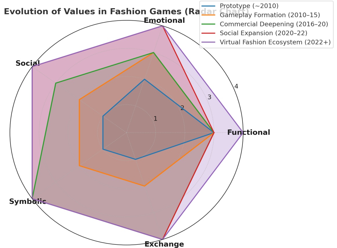 早期,2007年至2015年,以功能机制驱动为主,依靠关卡评分、搭配算法以及服装收集打造“玩法闭环”;中后期,2015年至2024年加强了情感体验和社会体验。时尚游戏本质不是“换装玩法”,而是“虚拟身份构建机制”。换装系统只是形式层,本质是个体如何通过视觉符号、服饰选择与他人互动,完成“数字身份”叙事与认同。价值结构重心从“功能–情感”向“符号–社会–交换”转移。即从“好玩”,到“好看”,再到“好被看”,符号、社交成为了新竞争点。