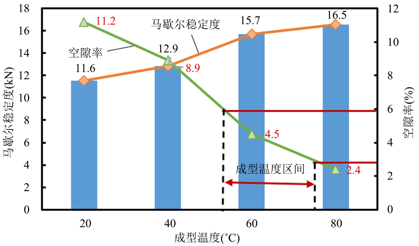 根据上述研究以旋转压实100次作为标准压实次数,进一步分析了成型温度对混合料性能的影响,按照热拌沥青混合料马歇尔稳定度试验方法分别测定不同温度条件下混合料马歇尔稳定度和空隙率指标如图9所示。