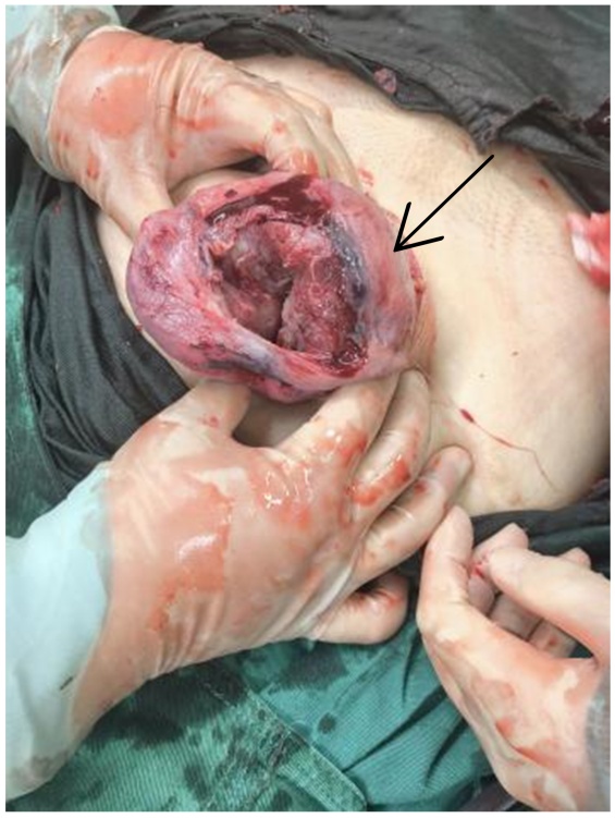 Figure 3. Transverse rupture at the uterine fundus, with a length of approximately 8 cm