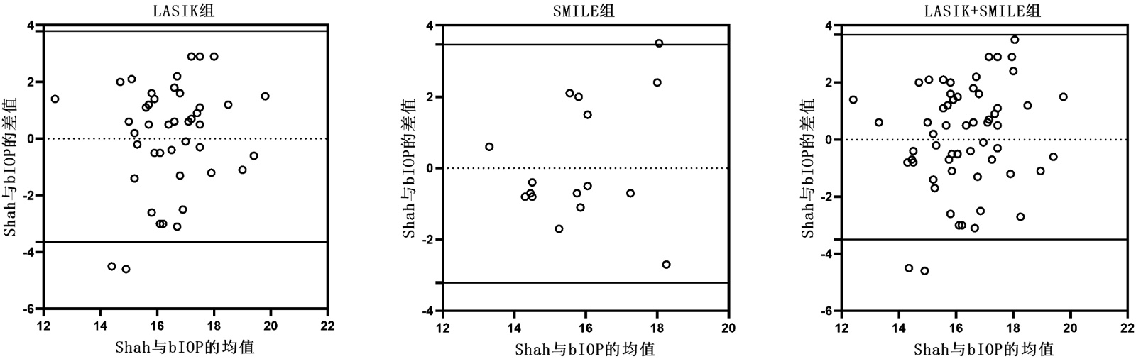 在LASIK组中,将术后Shah校正眼压公式与bIOP进行比较,有95% (41/43)的点在95%可信区间(−3.64, 3.79)之内;在SMILE组中,将术后Shah校正眼压公式与bIOP进行比较,有94% (15/16)点在95%可信区间(−3.21, 3.46)之内;在LASIK + SMILE组中,将术后Shah校正眼压公式与bIOP进行比较,有97% (57/59)的点在95%可信区间(−3.50, 3.67)之内,如图7所示。