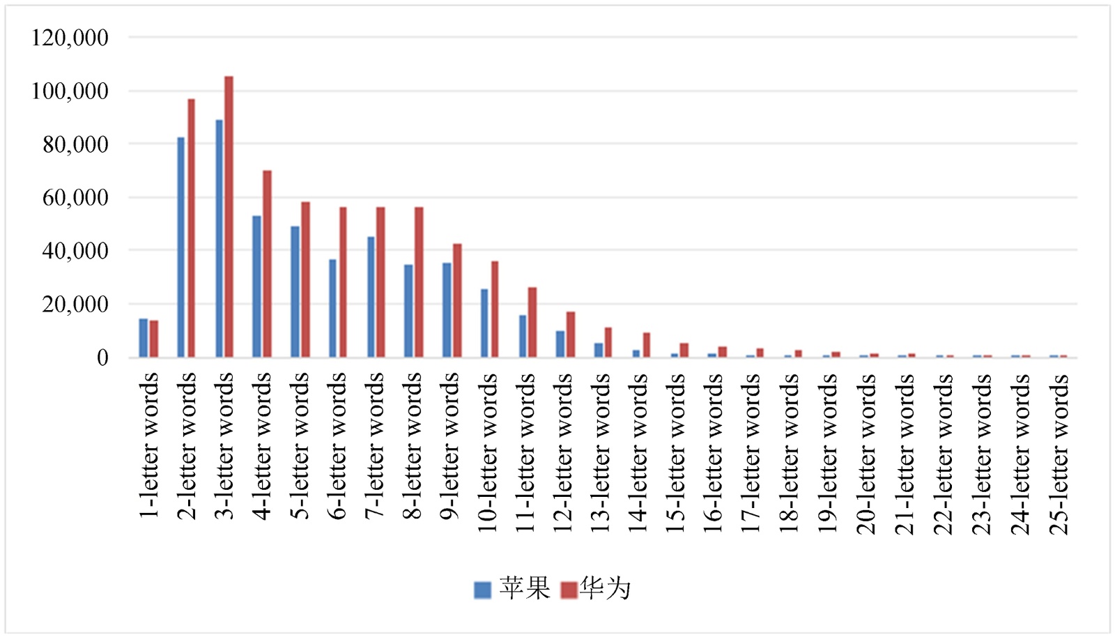 从表2可见,华为企业年报的平均词长和词长标准差都大于苹果,这说明华为企业年报在词汇选择上更倾向于使用较长、较复杂的单词。这种用词倾向可能会在一定程度上增加读者在阅读和理解主旨时的认知负担。进一步结合图2数据可知,华为企业年报在7个字母及以上词汇的使用频率(37.42%)明显高出苹果企业年报(30.61%),这在一定程度上可能增加了文本的整体阅读难度。