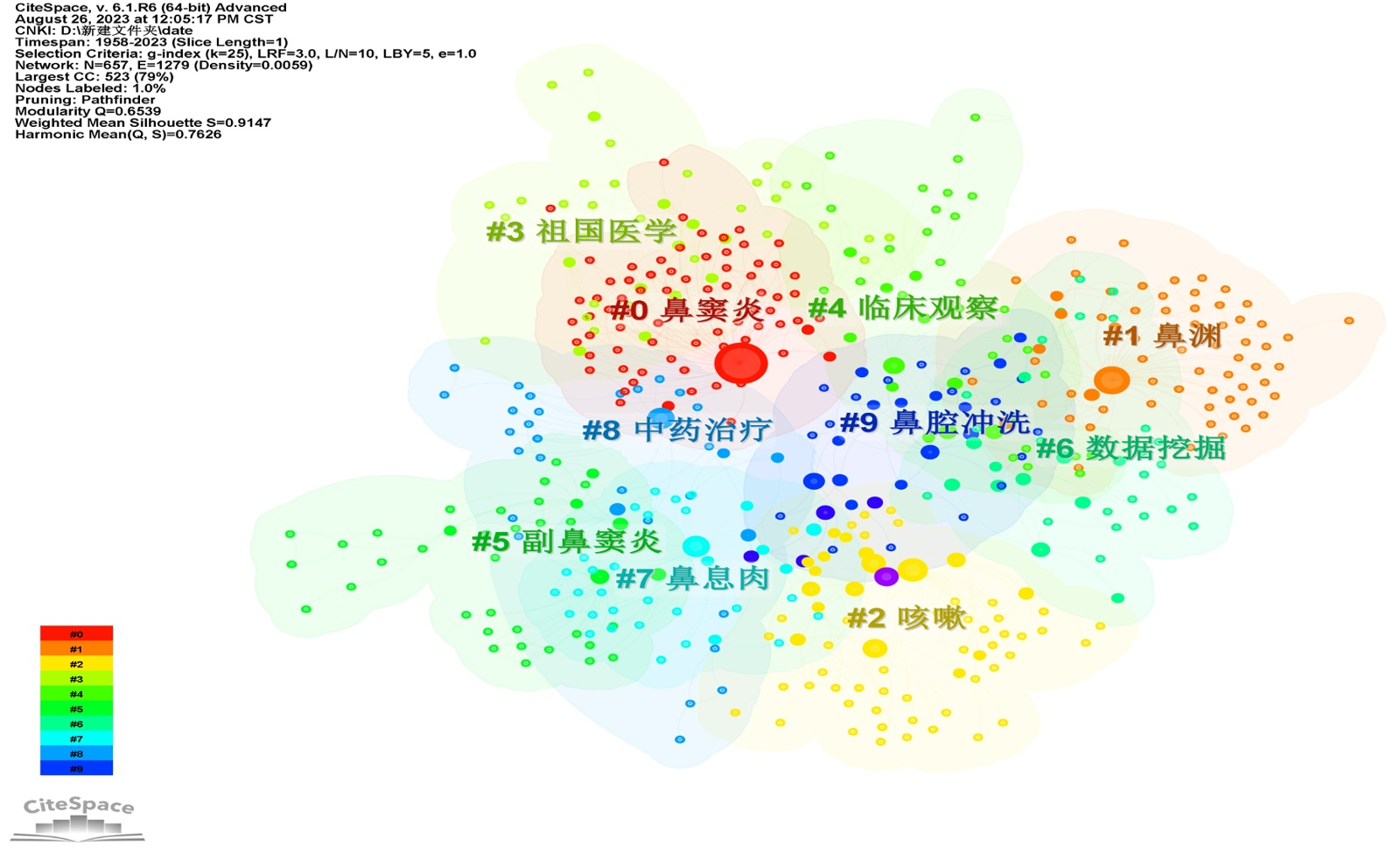对10个聚类进行归纳,最终分为3个大类:① #0、#5、#9为治疗方面,通窍开玄法、针灸治疗、滴鼻灵、鼻腔冲洗、中药汤剂等关键词表明鼻窦炎常采用中药汤剂口服、针灸治疗、鼻腔冲洗等方法,滴鼻灵是常用的中成药,通窍开玄法是常用治法。② #1、#4、#6是研究类型方面,名老中医、医案、临床观察、临床疗效、数据挖掘、综述等关键词表明中医药治疗鼻窦炎的中文文献研究类型主要为临床研究、名老中医医案、数据挖掘、综述四大类。③ #2、#3、#7、#8是研究对象方面,咳嗽、儿童、鼻甲肥大、嗅觉减退、鼻息肉、鼻内镜、手术、围手术期等关键词表明CNKI中文献的研究对象包括有典型嗅觉减退症状的鼻窦炎患者、有咳嗽症状的鼻窦炎儿童患者、鼻甲肥大或鼻息肉的鼻窦炎患者、手术后或围手术期内的鼻窦炎患者等几大类。