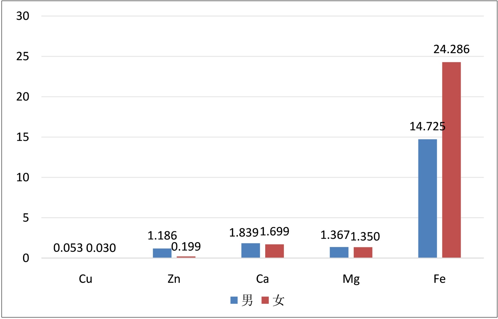 我们测出同一组别中不同性别血液Cu、Zn、Ca、Mg、Fe的浓度变化,并用Excel分析数据,结果见图6~8。