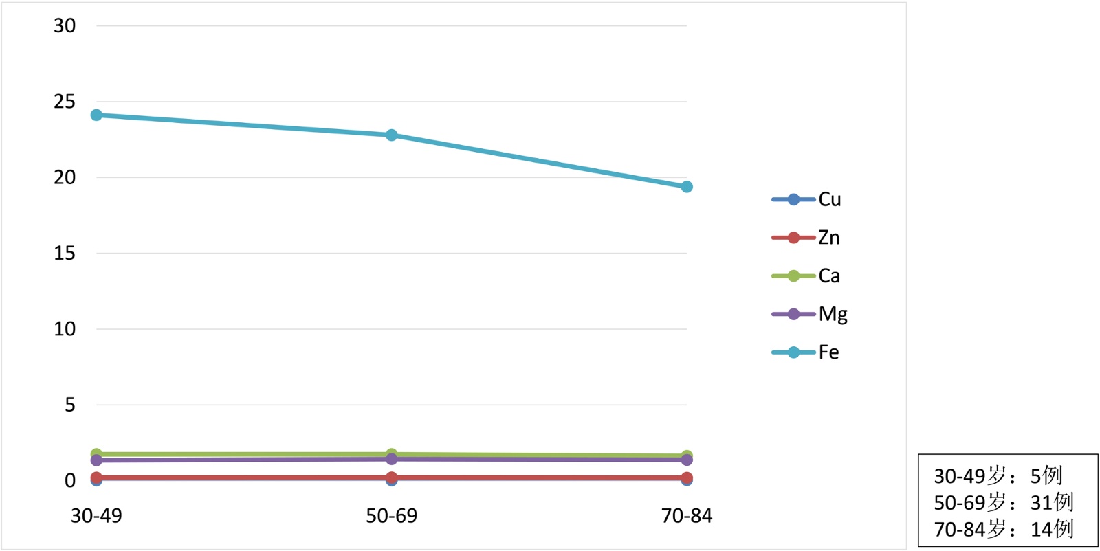 本研究50例结直肠癌患者中30~49岁5例,50~69岁31例,70~84岁14例,将不同年龄段进行比较,见图9。其中血液Cu含量为:30~49岁 < 50~69岁 < 70~84岁,且差异具有统计学意义(P < 0.05),说明随着结直肠癌患者年龄的增长血液Cu含量上升;血液Fe含量:30~49岁 > 50~69岁 > 70~84岁,说明随着年龄的增长,机体需要更多的Fe来维持生理功能,然而,由于结直肠癌导致消化道吸收不良从而出现血Fe含量较低。老年患者也可能因为牙齿问题、味觉变化或者消化功能减退等,导致含Fe食物摄入过少,这也是导致此结果的可能原因之一。了解与年龄相关的癌症背后的病理机制对于预防生理机能下降至关重要[19],因此我们需要更大的数据、更多的研究去验证这一结果。