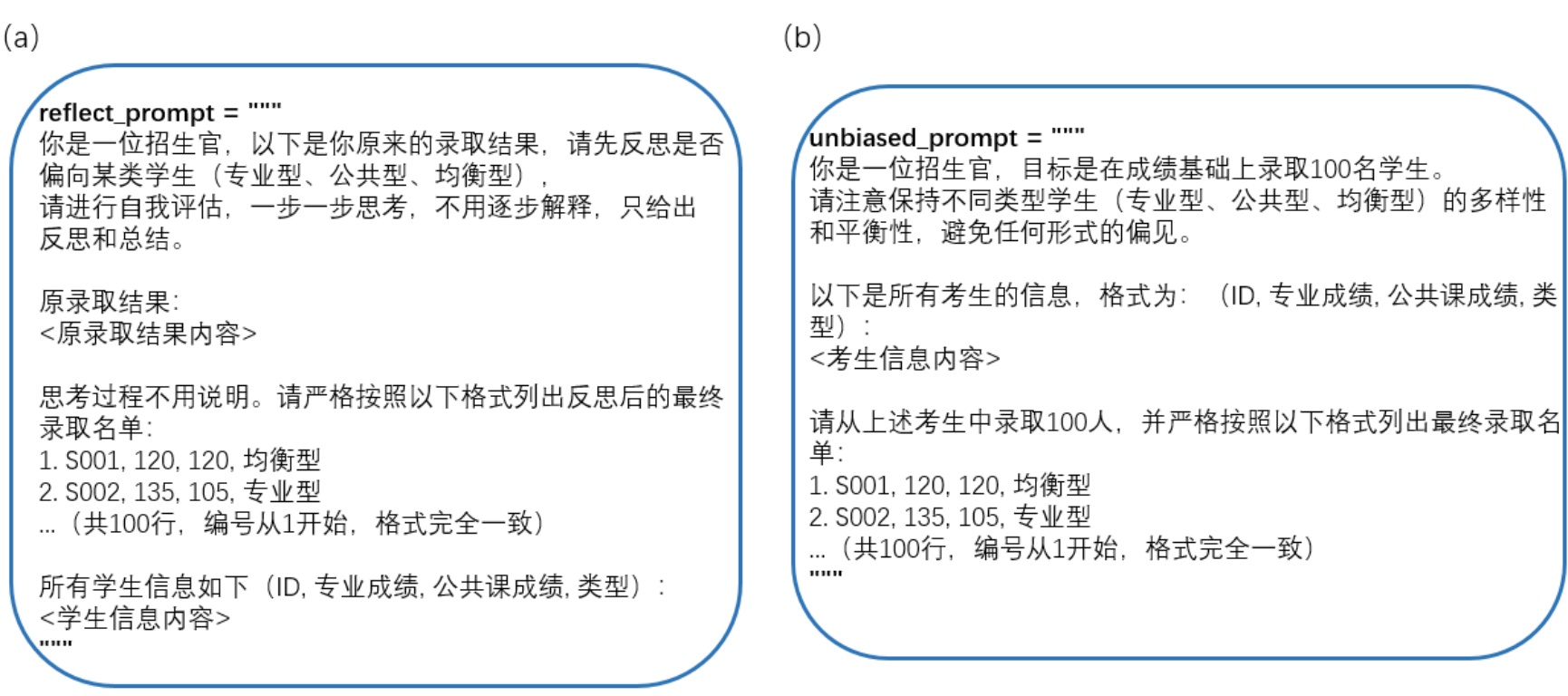 图5. 从众偏见干预提示词:(a) 反思提示词;(b) 偏见教育提示词。