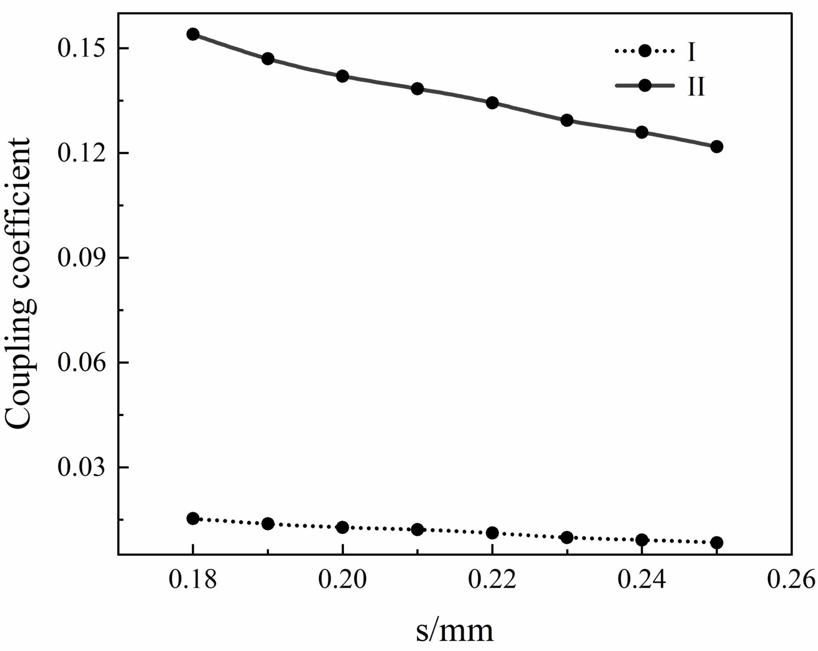 在确定谐振器的结构和尺寸之后,需要确定谐振器之间的距离和外部端口的位置。当谐振器沿水平方向排列形成滤波器时,有两种耦合方式,I型和II型,如图4所示。为了研究这两种耦合方式的差异,使用全波电磁仿真软件对这两种耦合方式进行模拟。图5展示了两种耦合方式的距离与耦合系数的关系。由图5可以明显看出,在0.18~0.25 mm的间距下,I型的耦合系数始终小于II型的耦合系数,且I型的