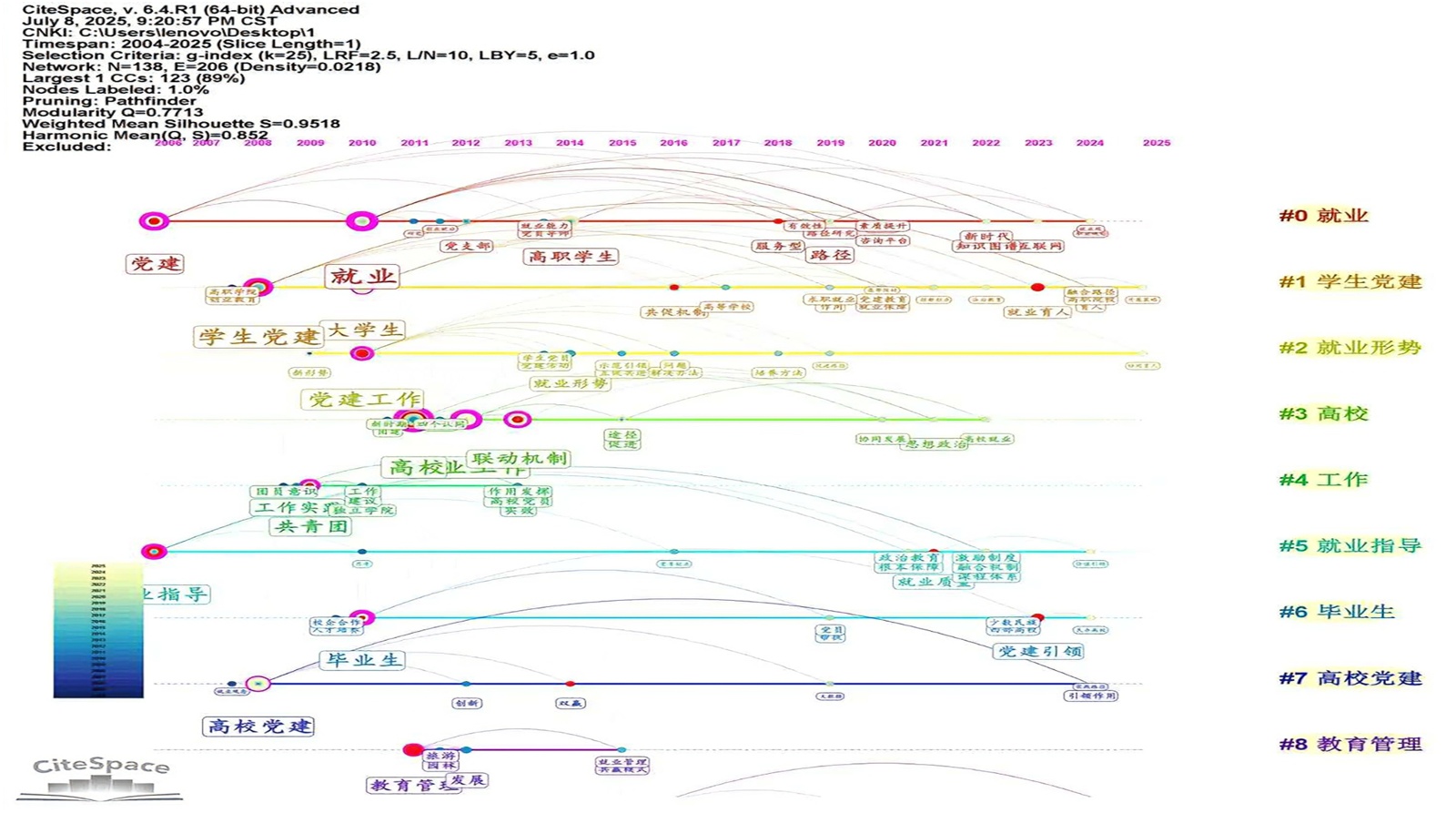 运用Citespace6.4.1软件对CNKI中主题为“大学生就业”的153篇文献进行可视化分析:设置时间跨度为2004~2024年,时间切片为1年,节点类型选择“Keyword”(关键词),阈值设置为Top 50,通过Pruning sliced networks (剪枝切片网络)优化聚类结果。分析内容包括:一是关键词聚类(见图3),识别“就业形势”、“就业指导”、“高校”、“毕业生”等核心聚类,明确研究热点的分布;二是突现关键词分析(见图4),捕捉“就业质量”(2021~2024年,Burst Strength = 0.85)、“就业育人”2023~2024年,Burst Strength = 1.52)等新兴议题,把握研究演进趋势;三是时间线图谱(见图5),梳理“基础融合(2004~2015年)–深度协同(2016~2024年)”的研究阶段特征,为构建纾解路径提供理论框架支撑。