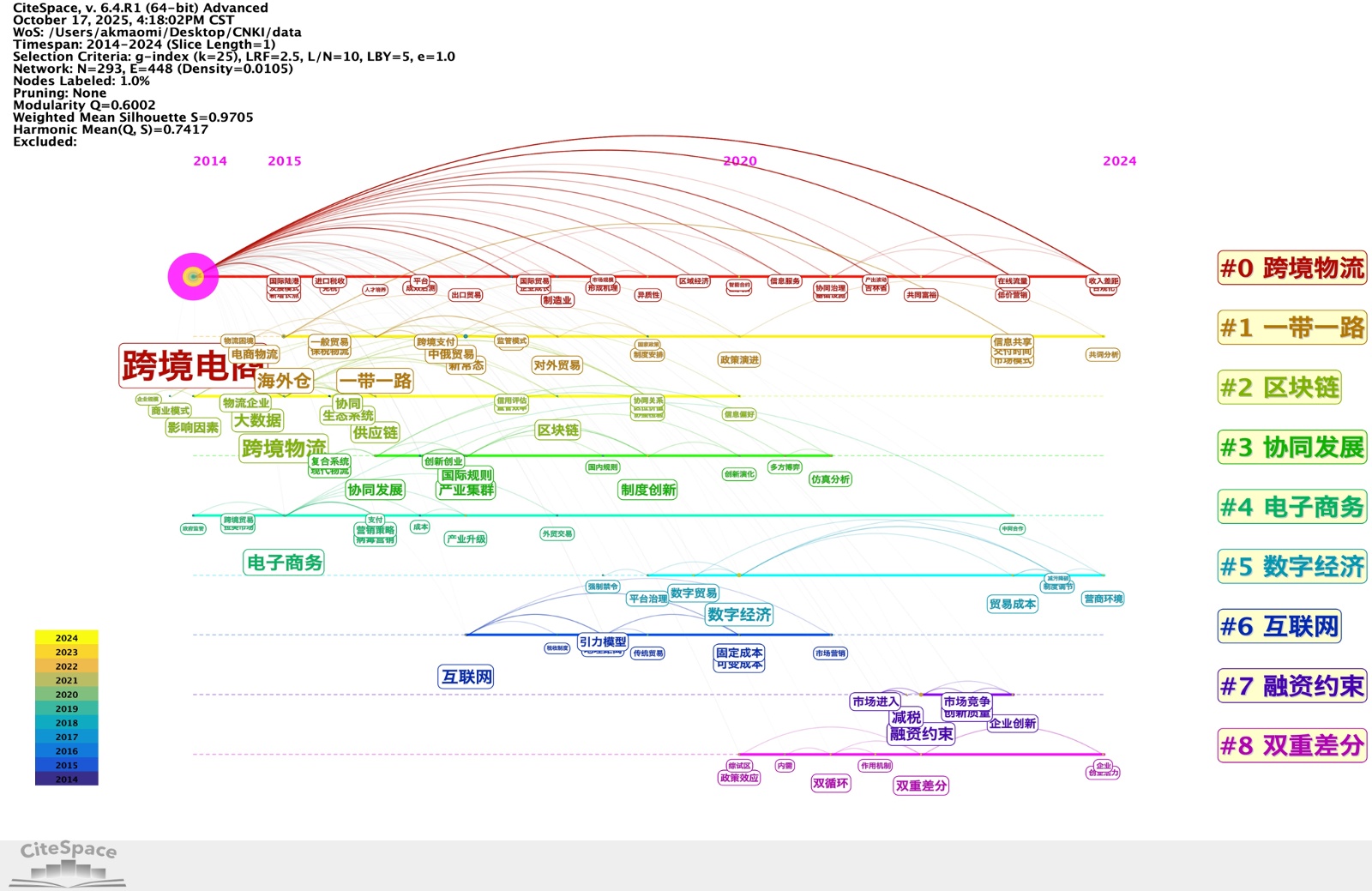 对关键词进行LLR法聚类处理,结果如图5所示,一共聚类出11个主题,分别是#0跨境物流、#1一带一路、#2区块链、#3协同发展、#4电子商务、#5数字经济、#6互联网、#7融资约束、#8双重差分、#9中小企业和#10东盟。跨境电商关键词共有293个网络节点,448条连线,网络密度为0.0105。CiteSpace依据网络结构和聚类的清晰度,提供了模块值(Q值)和平均轮廓值(S值)两个指标,一般而言,Q > 0.3就意味着划分出来的社团结构是显著的,当S > 0.7时,聚类是高效率令人信服的[4]。由图5的聚类图可知Q值为0.6002 > 0.3认为聚类结构显著,S值为0.9705 > 0.7说明聚类结果合理并且具有说服力。
