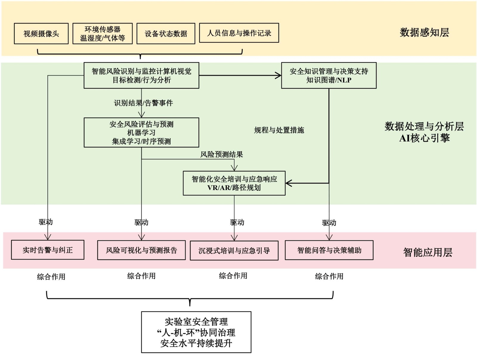 因此,当前研究在以下方面仍存在明显空白:一是缺乏对多类型、跨尺度风险关联机制的系统解析;二是尚未形成开放协同、支持跨平台数据融合的技术架构;三是在人工智能嵌入实际管理流程时,对制度协同与组织适应机制的研究明显不足。这些局限为本文的研究提供了明确的切入点:有必要构建一个整合风险全局认知、数据标准统一与多主体协同治理的新型管理框架,以推动实验室安全管理从单点式技术应用向系统化、自适应型的治理模式转变。综上所述,当前国内外人工智能技术与实验室安全管理已取得一定成果,但还是存在人工智能与实验室机构之间跨平台合作较少,落地应用较少,后期应技术完善人工智能的应用进而提升实验室安全管理水平。