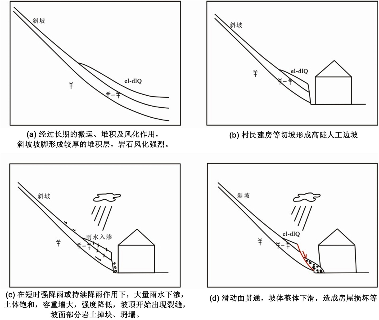 对于一些小型的土质、岩土质滑坡,滑坡形成之前,自然斜坡较陡,局部存在汇水条件,坡脚局部松散土层及风化层较厚,受建房、修路等人类工程活动影响,坡脚切坡形成人工边坡,导致下部临空,斜坡平衡条件被打破,受强降雨作用影响,大量雨水下渗使得坡体自重应力增加,渗透的地下水在坡内形成水压力,同时软化了岩土体和结构面,促使其物理力学强度降低,坡体开始出现裂缝、前缘土体出现小崩小塌现象,当变形进一步扩大突破平衡条件时,滑体下滑并堆于坡脚或对造成坡下建筑损坏[1] [2] (图1),该类滑坡规模一般较小,滑动速度较快,滑动形式以推移式为主。